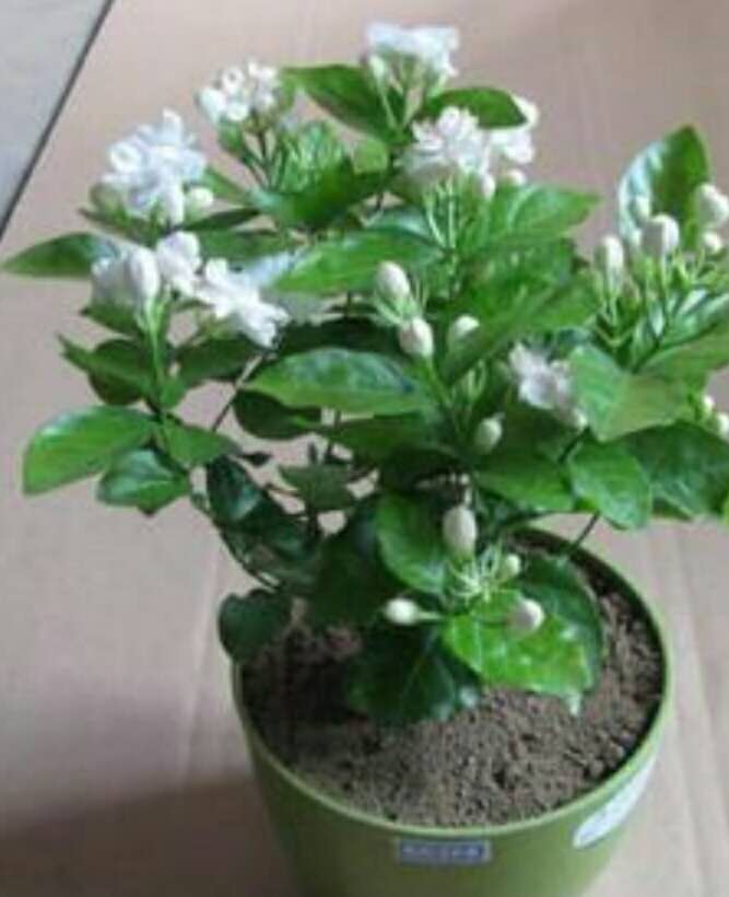 茉莉花叶对生,单叶,叶片纸质,圆形、椭圆形、卵状椭圆形或倒卵形,长4-12.5cm,宽2-7.5cm,两端圆或钝,基部有时微心形,侧脉4-6对,在上面稍凹入或凹起,下面凸起,细脉在两面常明显,微凸起,除下面脉腋间常具簇毛外,其余无毛;叶柄长2-6mm,被短柔毛,具有关节。聚伞花序顶生,通常有花3朵。