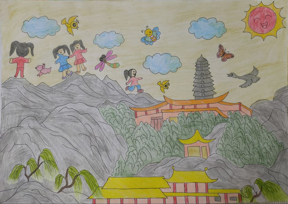 游山,作品展示了游山的愉悦心情,鸟语花香,景物美丽,充满趣味。