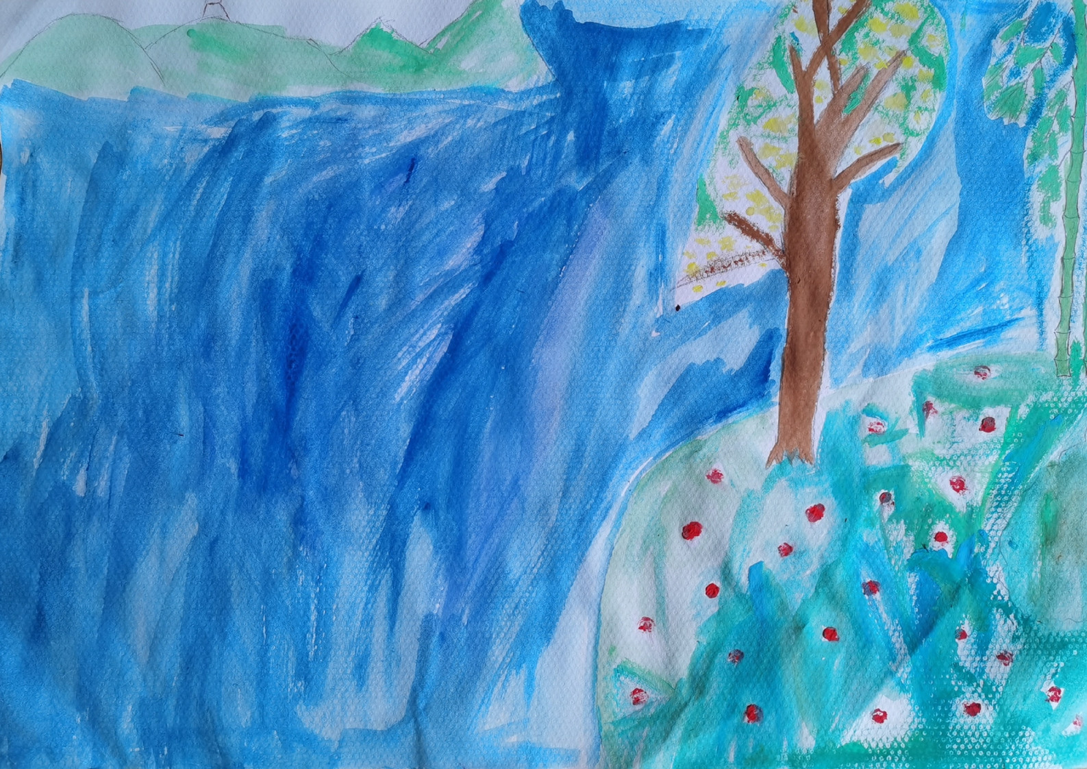 遥看草木送碧来,近看草深花稀疏。画面主体为山、花。山上有高塔,远望像一棵松树。一个人,一座房子,再望过去,山早已经绿了,穿上了夏衣。竹子显得非常幽静,挺立而又坚强,他们像一个军人。先用铅笔勾勒,再用浅色彩笔打底,然后再用颜料加深。以绿色为主色调,体现高山“盛夏”的特色。