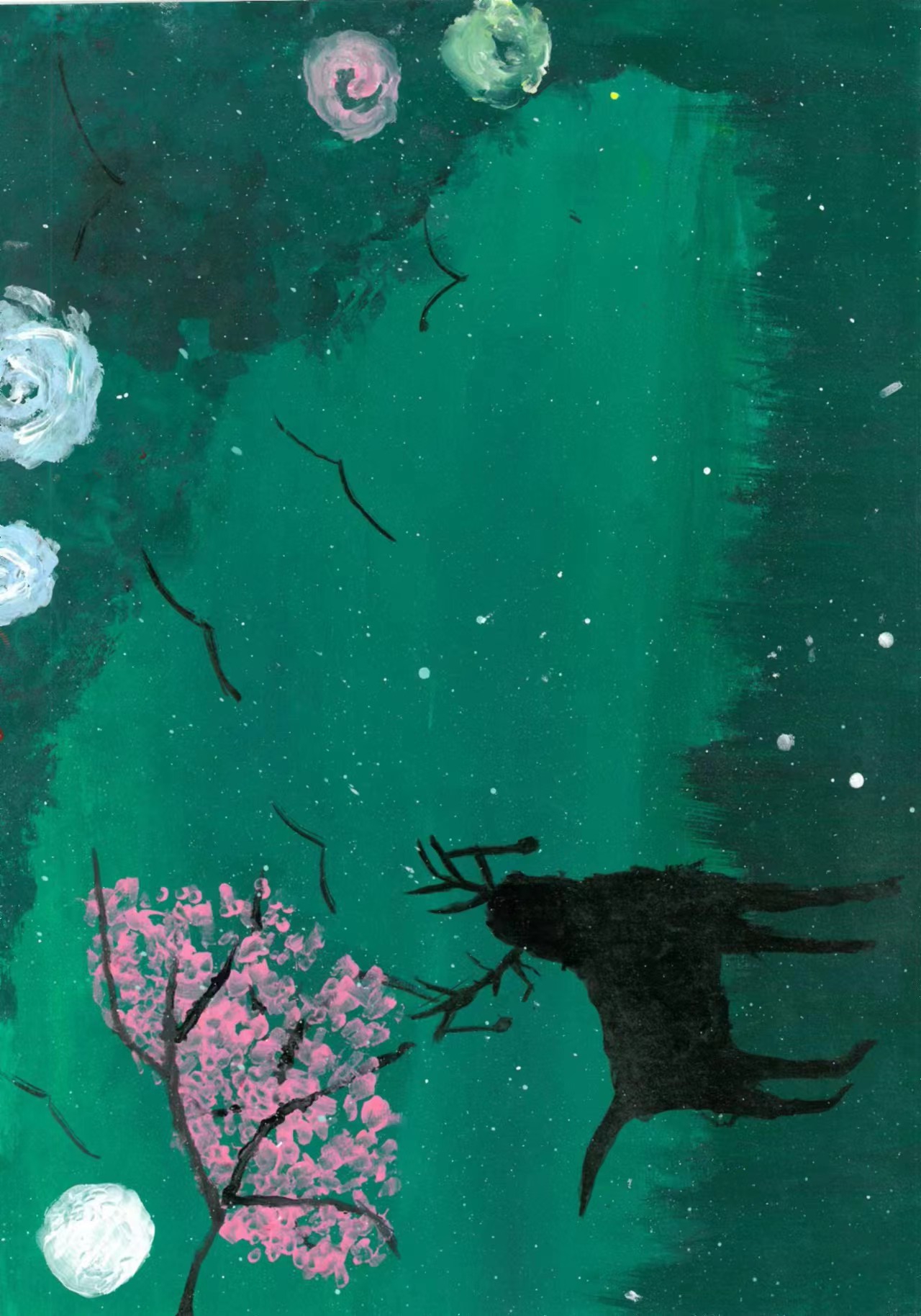 在森林里有一只活泼的小鹿,它很快乐,经常奔跑在丛林中,夜晚这只小鹿又在森林里奔跑,跑着跑着,突然发现了一轮月亮,那月亮真美呀,小路停住了脚步,在那里凝望着那轮月亮,月亮很漂亮,很洁白,正如小鹿那样,单纯无忧又快乐,生态环境保护很重要,让我们一起保护环境,创作属于自己的森林故事吧!