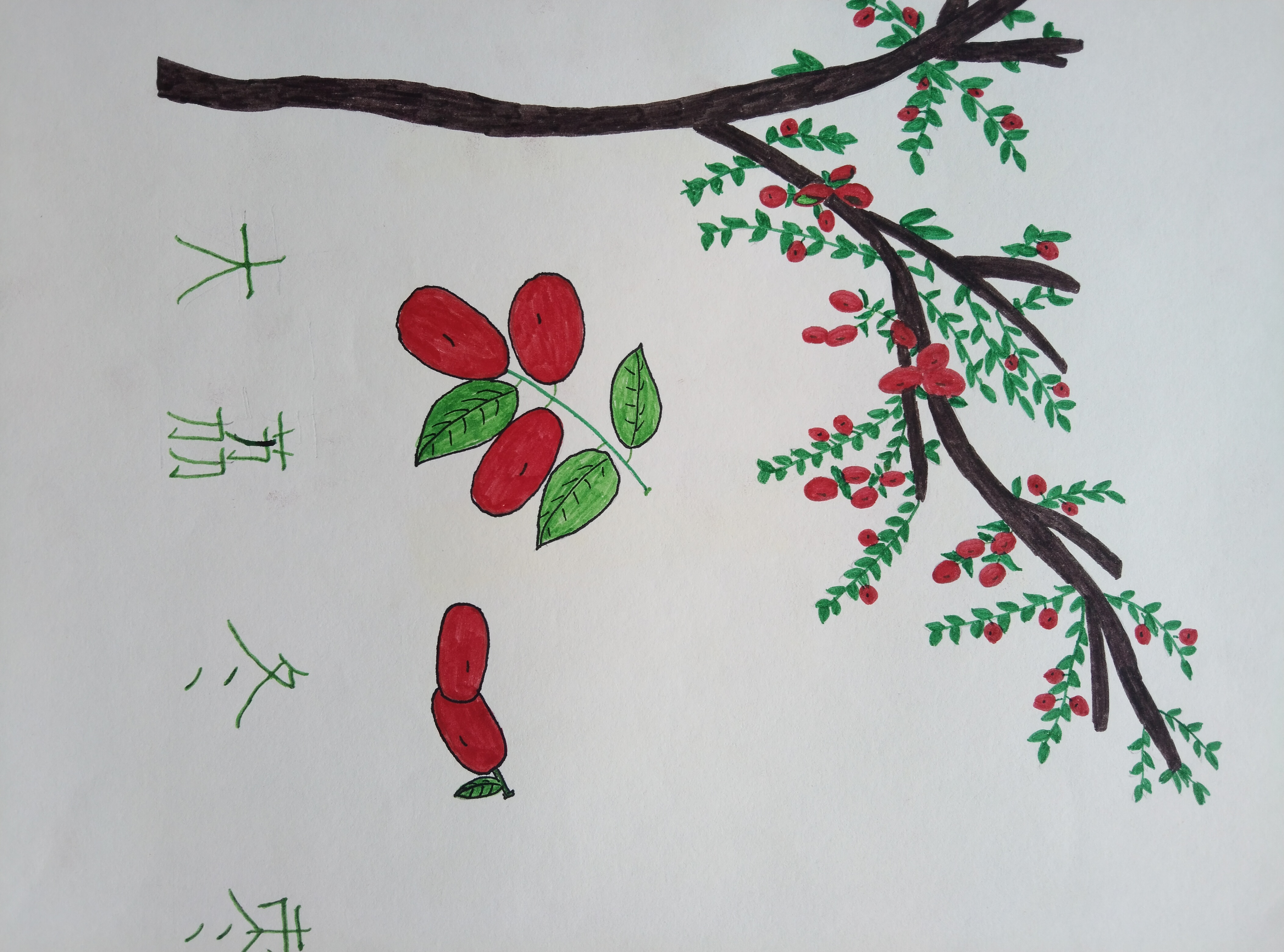 我们家乡大荔枣的栽培历史悠久,西汉时,大荔县沙苑一带就栽植有枣树。清乾隆时,凿井灌田,已具规模。现今沙苑一带,桃、李、枣、杏等各类果树遍地,且红枣的原生珍贵品种就达42个,这在全国枣区十分罕见,加之近年间引进的多个品种,大荔已然成为中国的“红枣种质天然资源”。我希望用我得副画能使我们家乡的冬枣畅销全国各地,让家乡的父老乡亲腰包鼓起来!