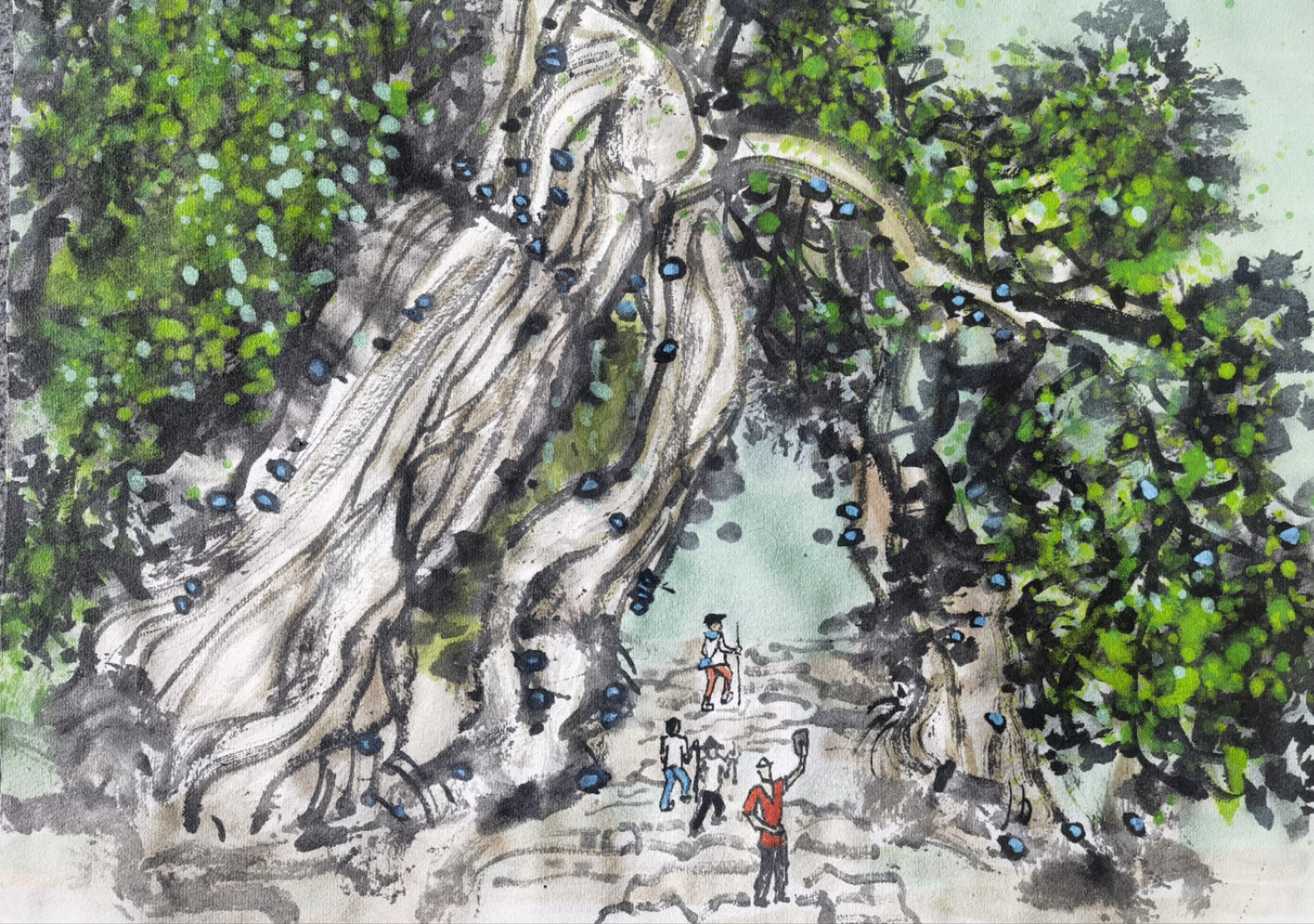 “两行古柏植何人?三百长程十万树。”参天古柏苍翠满目,川北蜀道绵延通幽,她就是被誉为“蜀道灵魂”“世界奇观”的翠云廊。本作品以中国画的手法,表现古柏的雄壮苍劲。作为青少年,我们将牢记习爷爷的嘱托,保护好古树名木,保持好生态环境,传承好中华优秀传统文化,用手中的画笔描绘祖国的壮美山河。