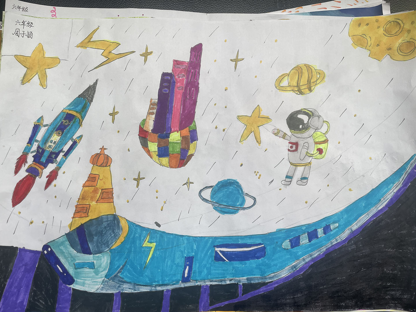 这幅画我画了太空飞船、太空列车,用这些来表达我对太空生活的向往和喜爱,随着现在航天技术的不断发展,我相信以后我们一定有机会进入太空,去领略不同的宇宙风光,我要更加努力的学习,以后有机会去探索那些未知的太空世界。