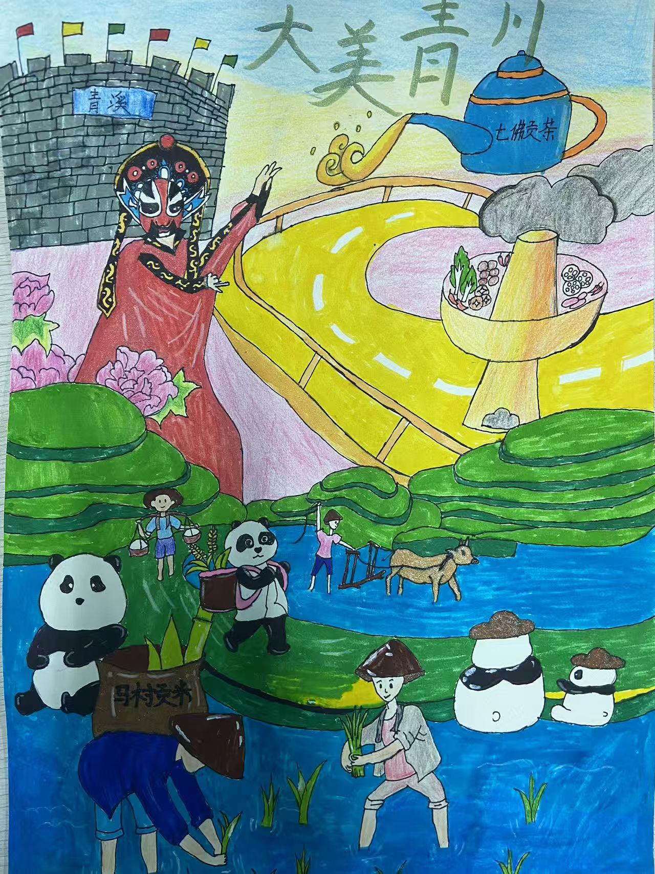 这幅画是对广元市青川县特色的精彩呈现。画面中,"七佛贡茶"以巨型茶壶的形象倾泻茶香,"马村贡米"伴随熊猫与农耕场景展现农耕底蕴,"青溪"古镇的城楼与戏曲人物彰显历史人文,青川铜火锅升腾的烟火气则传递出饮食文化的独特魅力,多元素融合,绘就了"大美青川"的多彩画卷,尽显其在物产、人文、饮食等方面的深厚底蕴与独特风情。