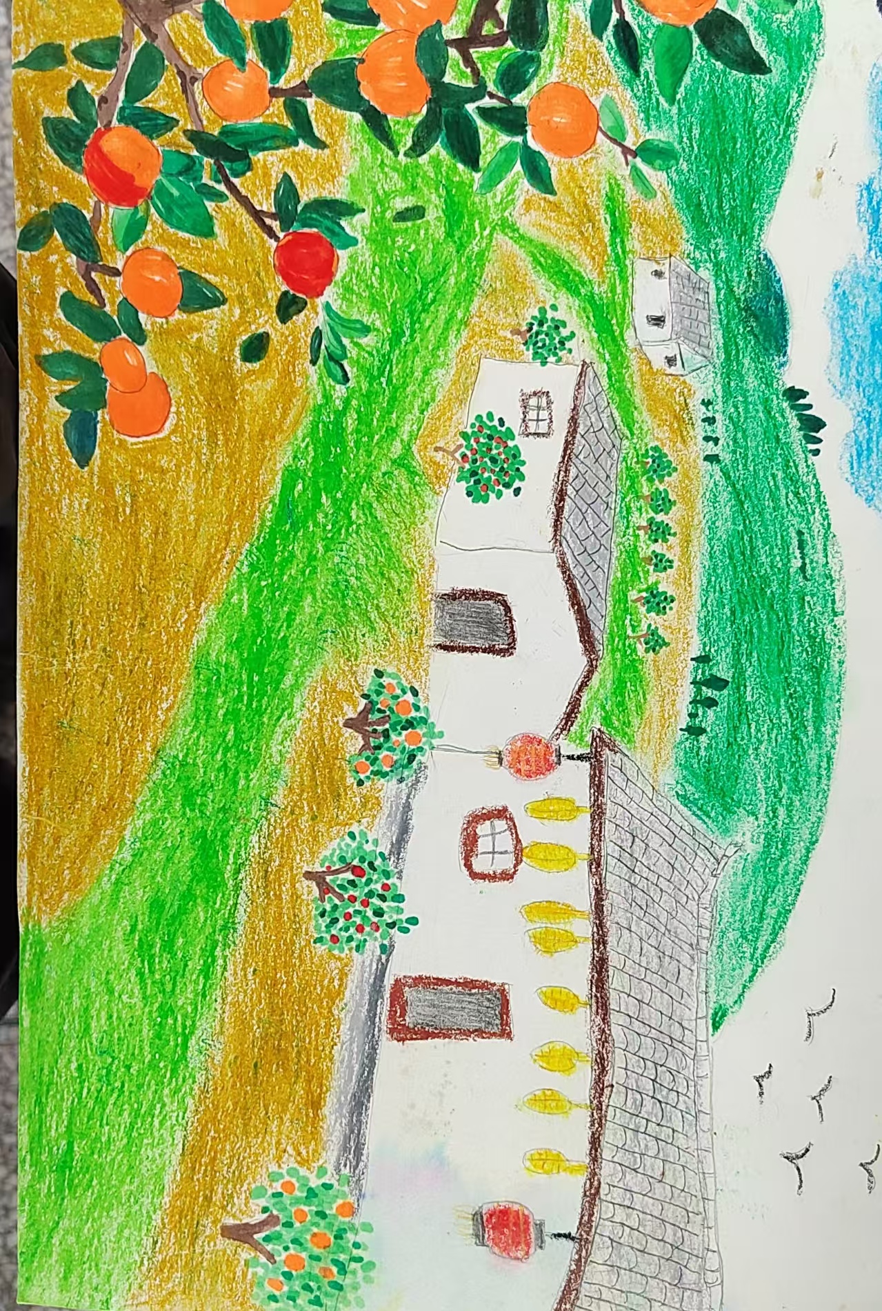 这是我的家乡蒲江县敦厚乡。错落的老房,屋承载着乡土记忆,散发质朴温度。枝头饱满的蒲江丑橘,是家乡响当当的名片。一到丰收季节,空气中弥漫着丰收的香甜。天空中大雁列队飞过,好像在欣赏家乡的美景,又好像在与满树的丑橘打招呼,又好像在为果农庆丰收。