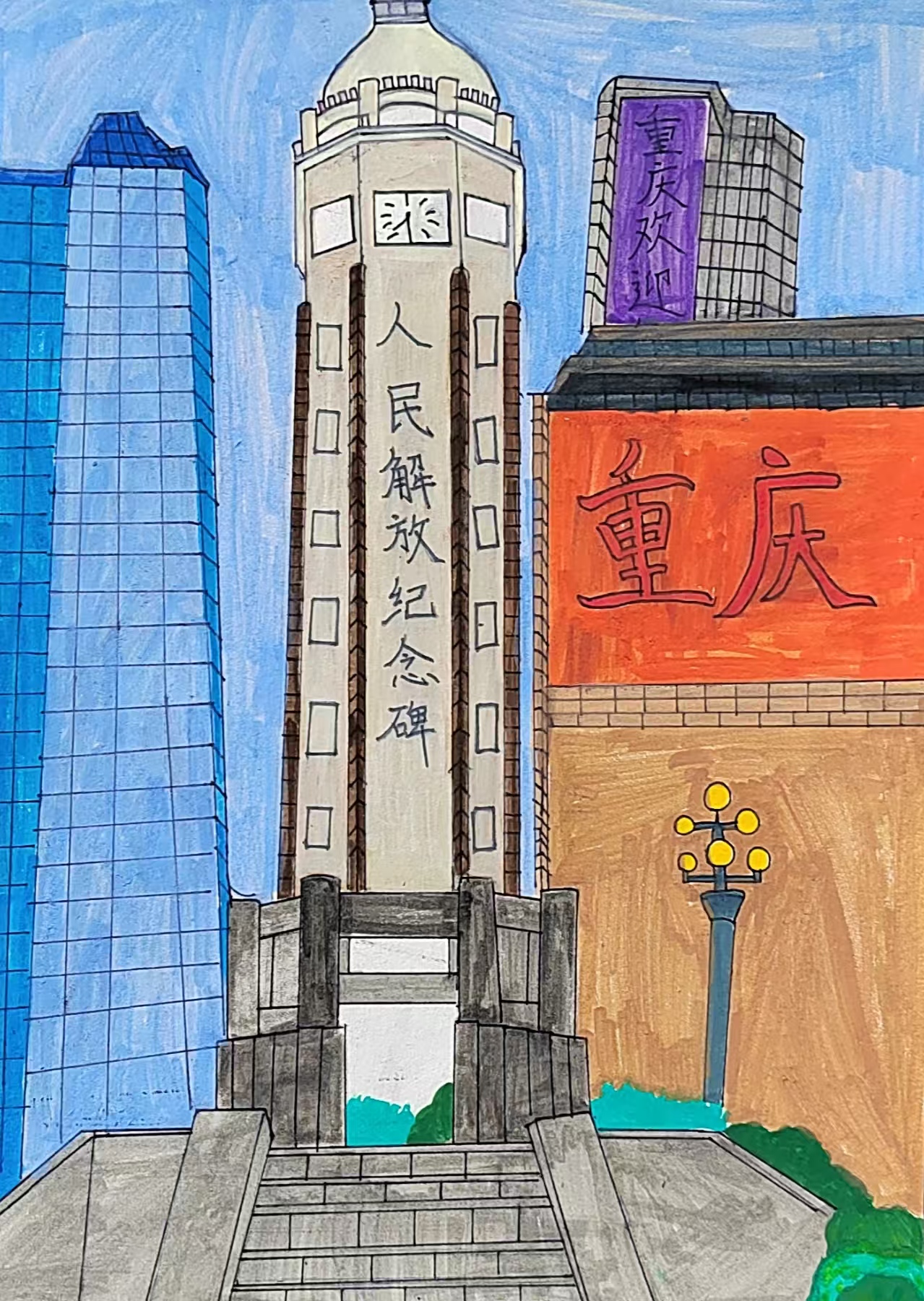 重庆人民解放纪念碑,是重庆市的标志建筑物之一,原名"抗战胜利纪功碑",1950年由刘伯承改成现名。它是全中国唯一的一座纪念中华民族抗日战争胜利的国家纪念碑。它的碑体绝大部分呈白色,有些地方是肉色,上端有几架大钟,朝着四面八方,每到整点时,便会响起声音。塔是八角形的,最顶端有几根天线。