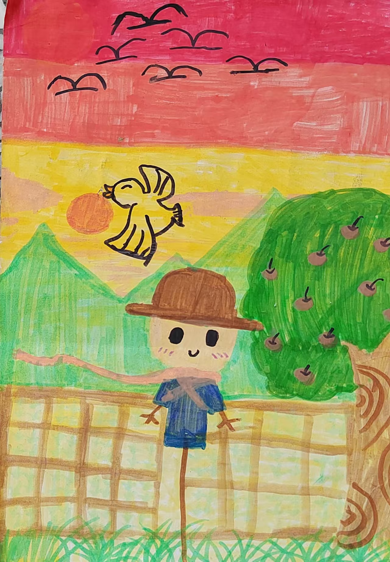 我的家在蒲江县一个小村庄,这里有一望无垠的麦田,每到秋季,麦子成熟了,到处弥漫着一股浓浓的麦香,令人心旷神怡。这个时候,也是鸟儿们最忙的,他们忙着吃食,去偷农民伯伯辛辛苦苦种出来的粮食,农民伯伯为了防止它们来偷吃,就是麦田中间竖一个稻草人,来吓那些偷吃的鸟儿们。