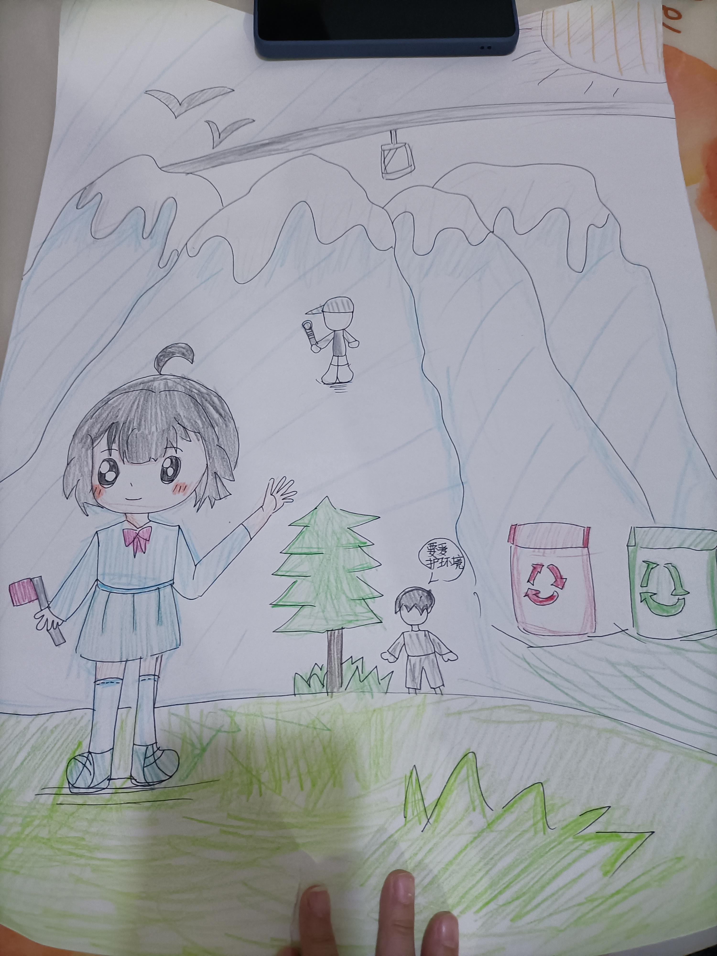 这幅画以“环保”为主题,展现了一幅清新的自然场景。画面中有可爱的女孩手持工具倡导环保,远处雪山下有人参与环境维护,还有明确的垃圾分类桶。绿树、草地与飞鸟构成美好生态,人物的行动和“要爱护环境”的提示,传递出人人参与环保、守护自然的积极理念,呼吁大家从身边小事践行环保,共建美丽家园。