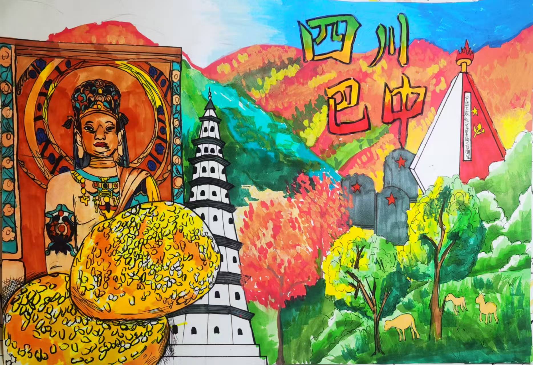 这幅画展现四川巴中多元风貌:左有南龛石窟佛像,彰显历史人文;恩阳提糖麻饼色泽诱人,是特色美食;凌云塔古朴雅致;光雾山枫树林色彩斑斓;南江黄羊点缀其间;还有红军主题元素,凸显“红军之乡”底蕴,尽展巴中自然、人文与红色文化之美。