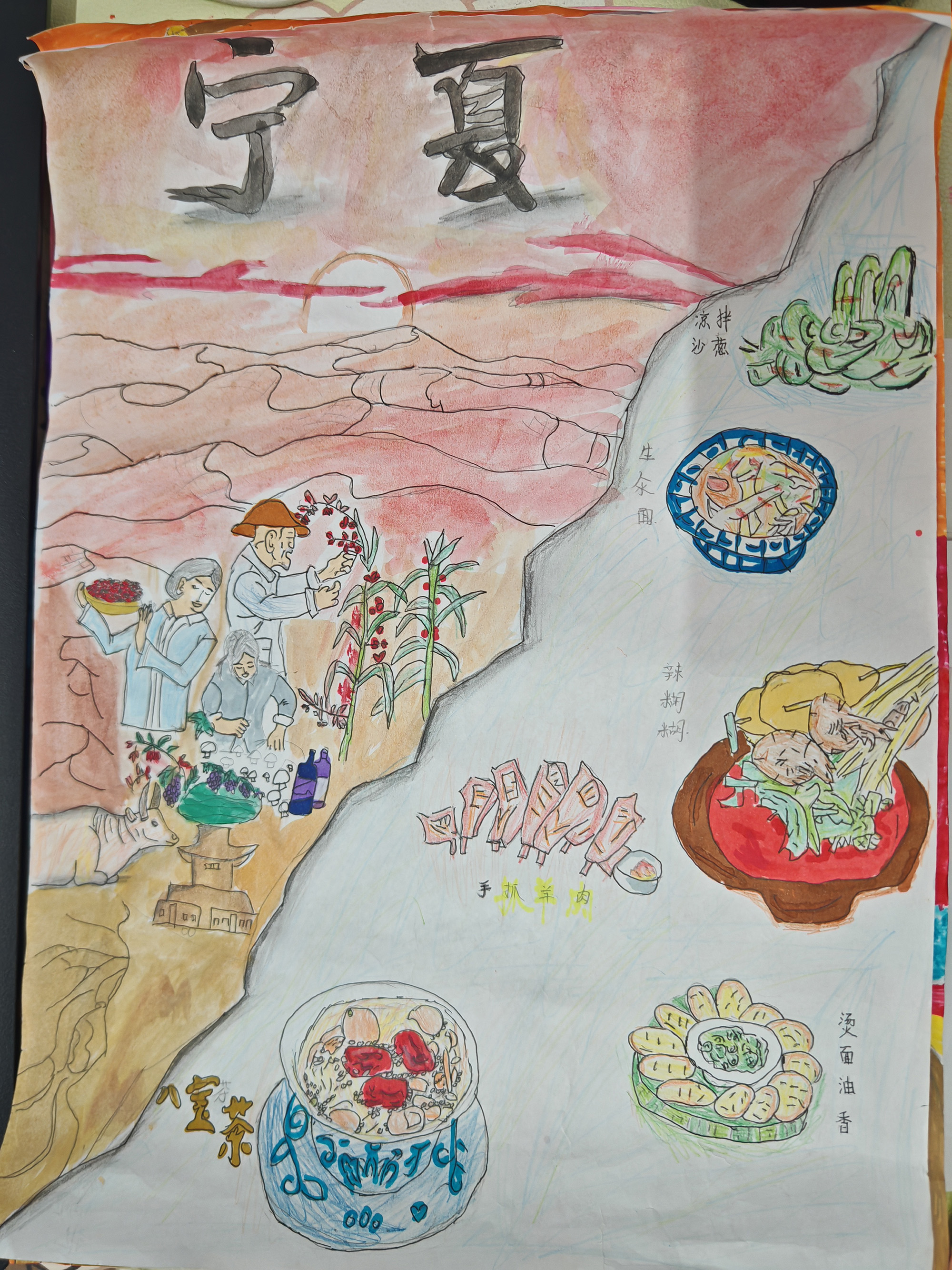 在我的作品中呈现出了宁夏的美食特色。中国文化多种多样,我唯独中意宁夏的特色。 在我的作品中出现了枸杞,手抓羊肉,八宝茶......枸杞:色泽鲜艳,而且力大皮薄肉多,就这样被载入中国的药典其中!他泡茶也是很美味的。手抓羊肉:肉质鲜嫩美味,再配点秘制调料更是一绝。八宝茶:这是个好东西,里面包含多种有营养的食材,如红枣,桂圆,枸杞和不同的花类,所以他很养生。 之所以这么画,体现宁夏美食的多种多样。
