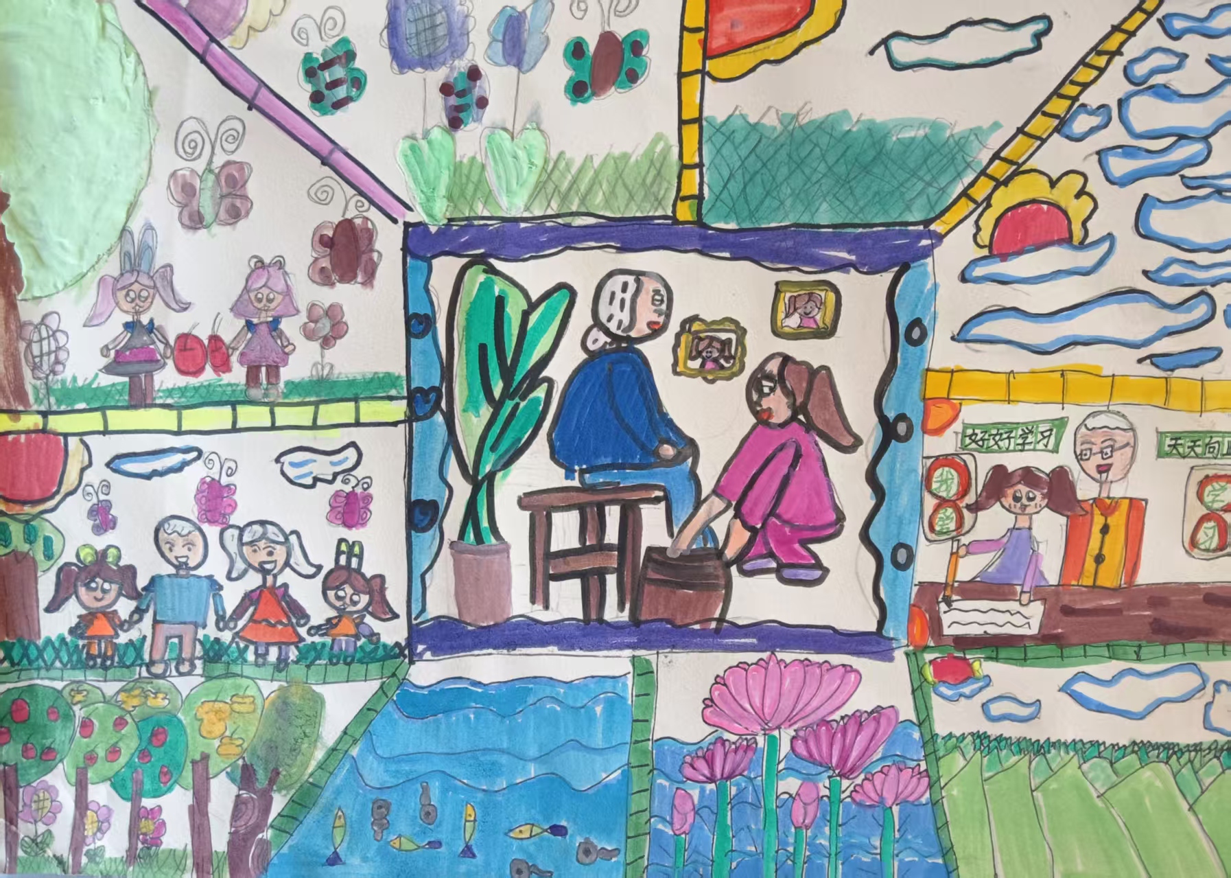 成长的日子总是暖暖的。晨光漫进堂屋,爷爷会铺开宣纸,握着我的手练毛笔字,墨汁在纸上晕开时,他总说“字要端,人要正”。 傍晚的天井里,妈妈常蹲在小板凳上,给奶奶洗那双长了许多硬硬老茧的脚。温水溅起细碎的声响,混着奶奶的笑声,落在青砖缝里。