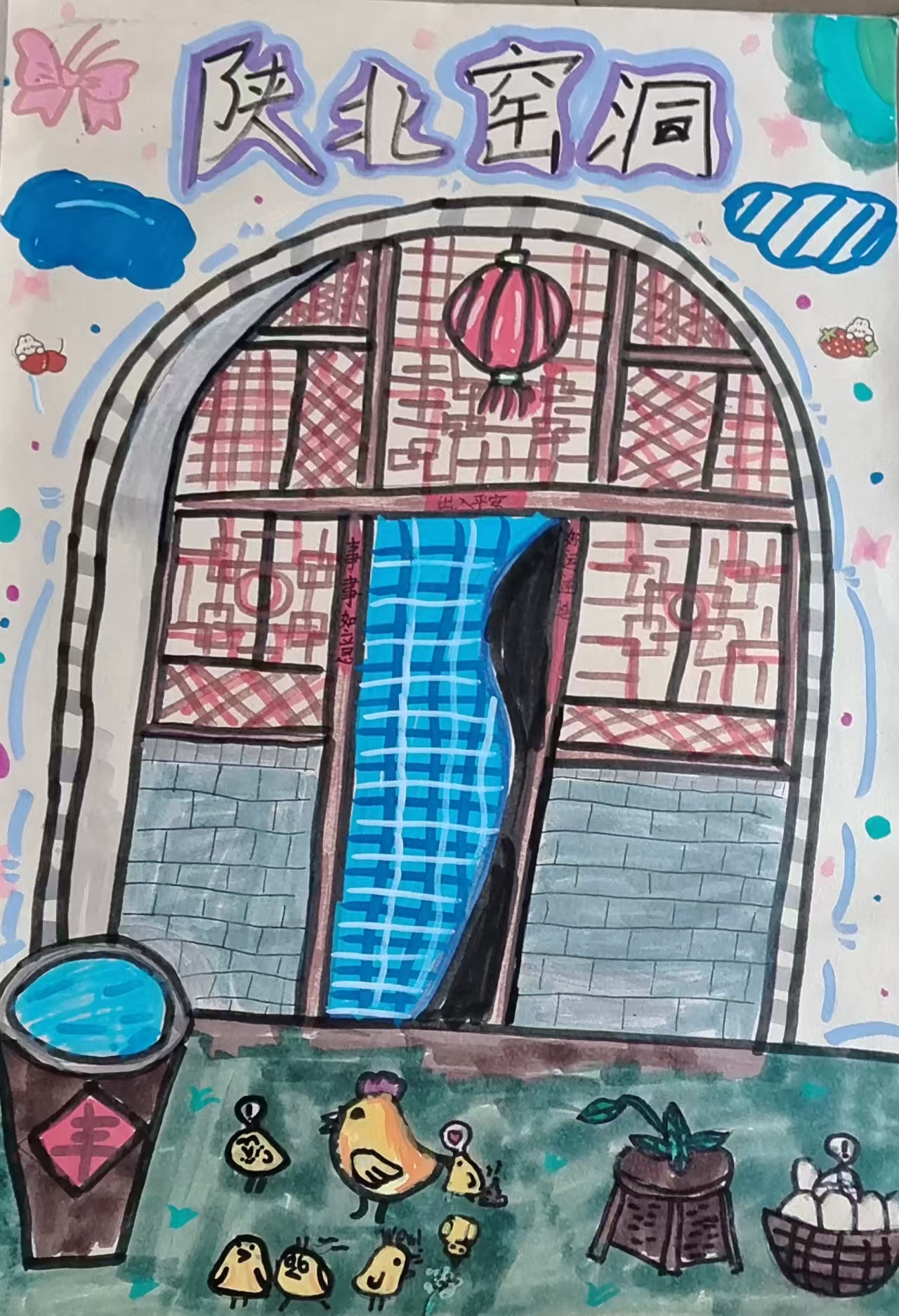 陕北窑洞绘画理念:以土黄、赭红为主色调,还原窑洞的质朴质感;用简练线条勾勒拱形门窗、陕北窗花、院落碾盘等元素,融入放羊、陕北秧歌等生活场景,既展现窑洞的地域建筑特色,又传递出黄土高原上的生活气息与人文温度,让画面成为陕北人坚韧乐观生活的缩影。