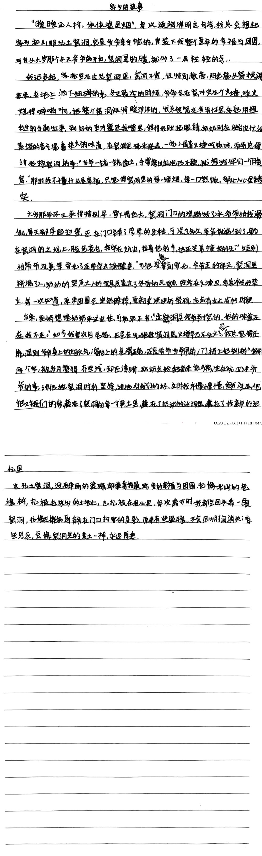 以北山土窑洞为核心载体,构建“物质空间-情感记忆-精神传承”的三层叙事逻辑: 空间符号层:以爷爷亲手挖掘的痕迹、火塘的噼啪声响、窗棂洒下的细碎阳光,将其塑造为童年幸福与团圆的物质容器,体现黄土高原民居的独特性。 情感记忆层:通过爷爷扫雪铺麦秸、喂红枣,奶奶灶台忙碌等细节,把窑洞转化为亲情的情感场域;以爷爷离世后窑洞的变化,展现团圆与别离的情感张力,让个人成长与家族记忆深度绑定。 精神传承层:将窑洞升华为家乡精神的象征,它如北山老槐树般扎根土地与心灵,其承载的温暖与思念如同黄土般厚重永恒,最终落脚于“窑洞是乡愁的永恒底色,是家族之爱跨越时空的传承载体”,诠释家乡在精神层面的深远价值。