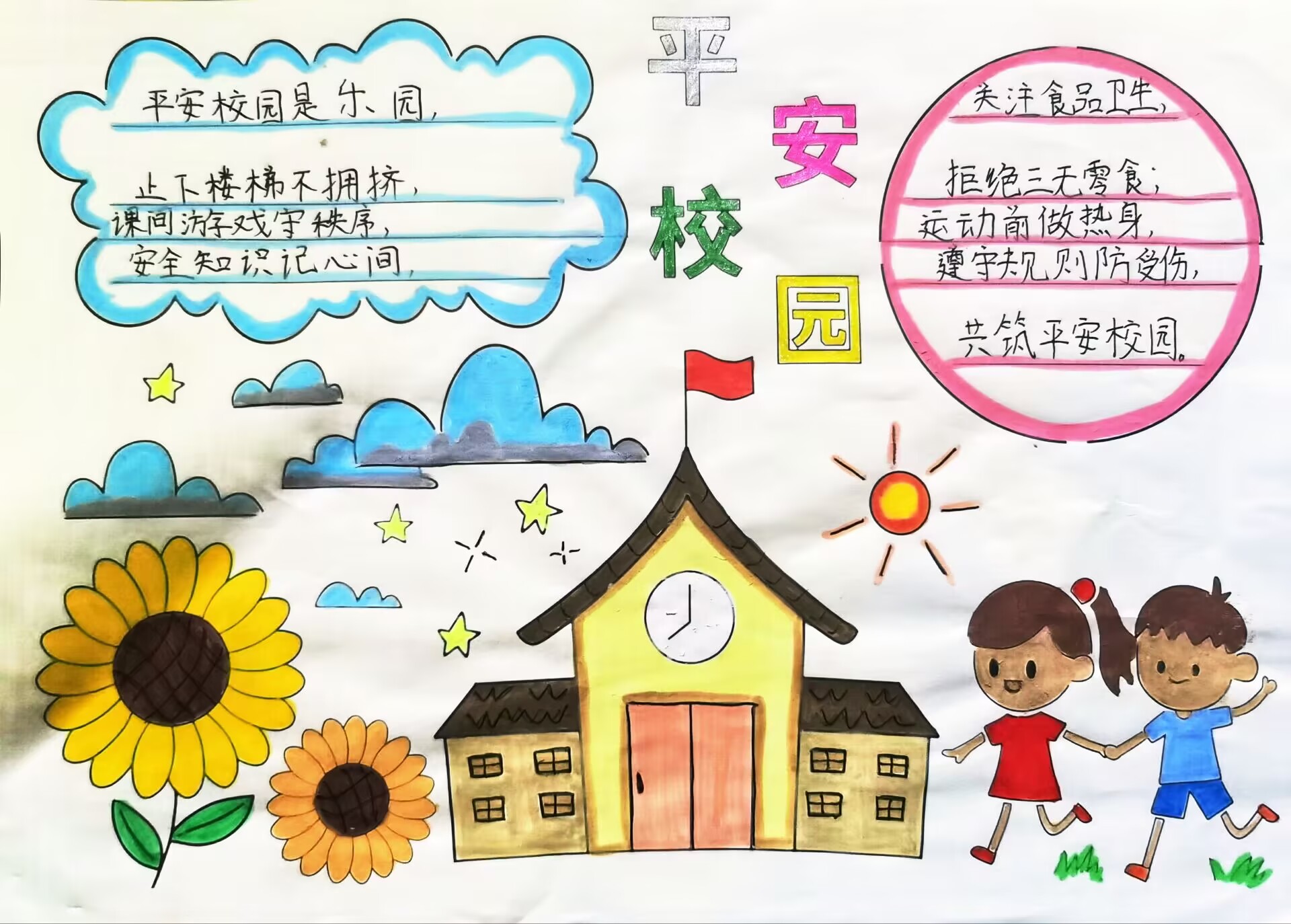 大家好!我画的是《我们的平安校园乐园》。我们学校就像个安全又快乐的乐园,有漂亮的教学楼,还有大大的向日葵。在学校里,我们要记住安全知识,不挤楼梯,不乱跑。这样的校园让我们每天都能开心学习、快乐玩耍。希望大家都能在平安校园里,像我们一样每天都有好心情,一起健康成长!