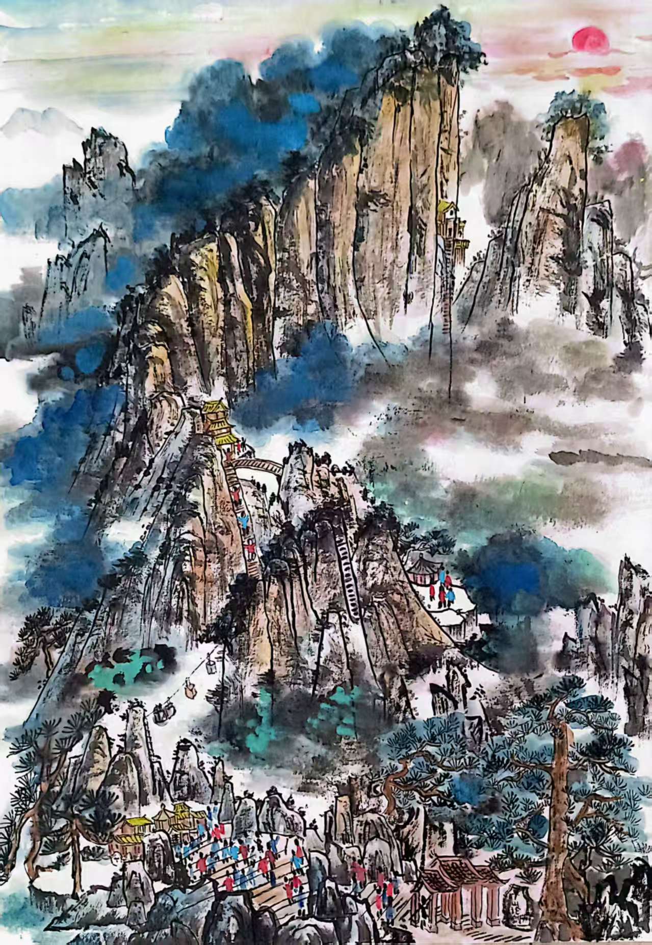 此画描绘了天下第一险华山,古有美誉"奇险天下第一山",通过山水与人的相交容错,形成了人与自然和谐共生的美好画面。整幅画气势磅礴有力,令人感到华山的"险与奇特",松树的坚韧不拔和山石的变化多端,利用由近至远的视觉观感进一步体现了华山之险,突出此幅画作的核心思想,此画也寓意中华民族自古以来的面对困难的坚韧不拔,不畏艰险勇攀高峰的崇高精神。