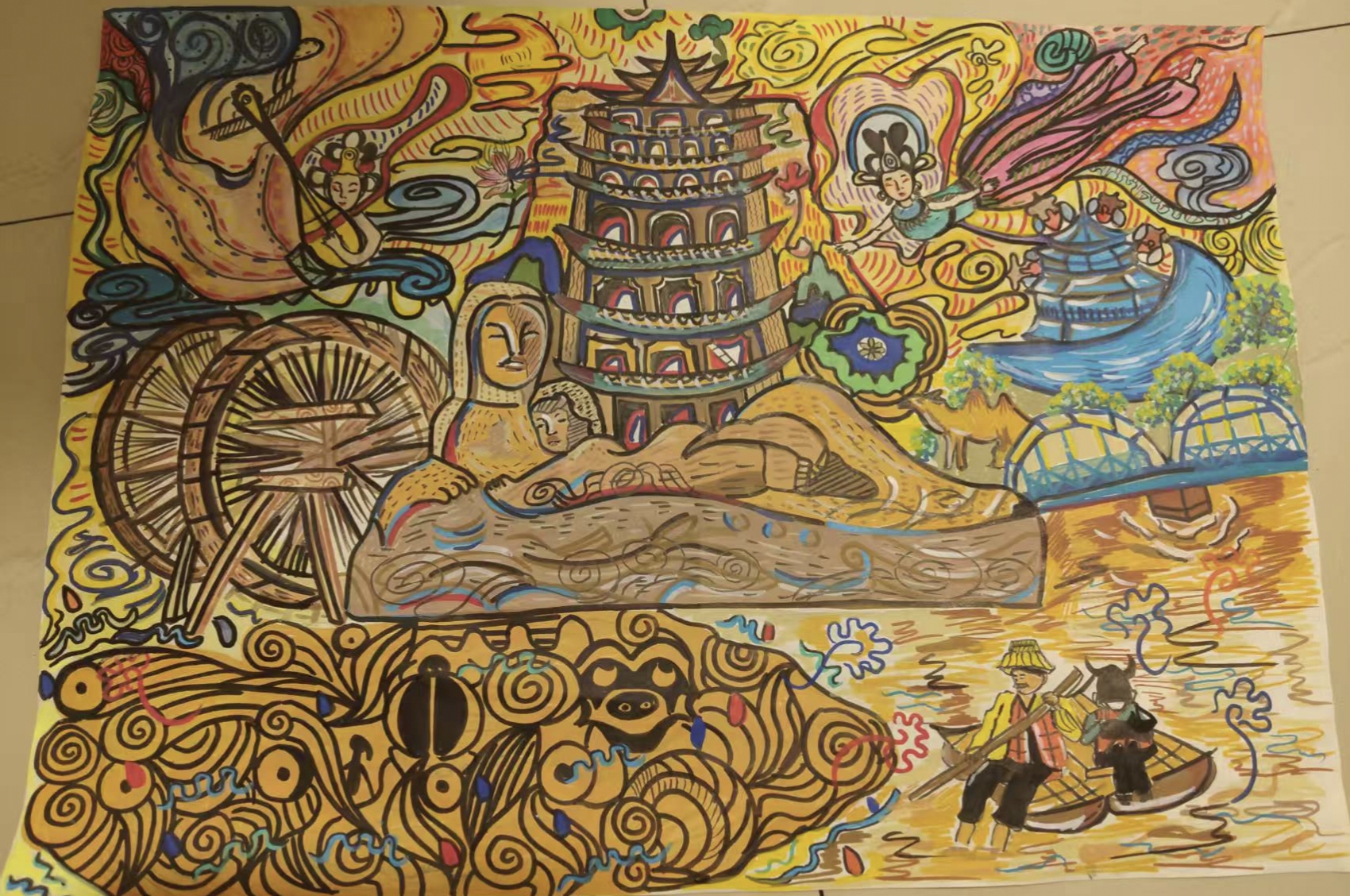 创作背景:我的家乡在兰州,是一个美丽又富饶的城市。这里有黄河穿城而过,流经市域150.7公里。当然黄河母亲雕塑则是黄河文化和中华民族母亲形象的代表。 核心理念:这幅画的主要内容是兰州的一些标志性建筑和一些旅游景点。在细节上还添加了飞天形象和古老的交通工具羊皮筏子。这些事物都可以让观者更了解兰州,也可以体现我对兰州的热爱。 表达方式:色彩上我以敦煌壁画彩绘的元素特点,多以土黄、粉黄和深褐为主,再以中绿、粉绿等色彩加以点缀。我还添加了一些敦煌壁画图案,在黄河旁边将马家窑彩陶文化揉进去。整体色彩浓厚却又很自由。把两个看似冲突的风格很自然的结合在一起,让观者看到不一样的兰州。