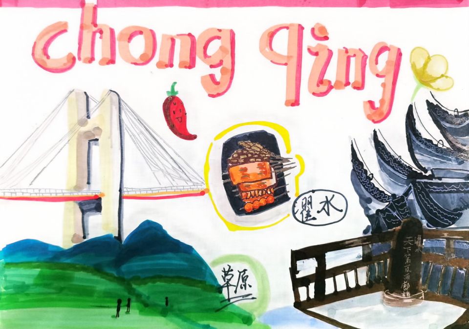 大家好!我画的是《重庆家乡美景欢乐图》。重庆是 “桥都”,大桥一座比一座壮观;仙女山的草原绿绿的,像块大绿毯;濯水河的风景古色古香,超有韵味。还有香喷喷的烤串和红红的辣椒,好吃到停不下来。重庆的美景美食太多啦,每次想到这些,就觉得家乡超棒。欢迎大家来重庆,看看桥都的桥,逛逛仙女山草原,游游濯水河,尝尝烤串,保证你们玩得吃得多开心!