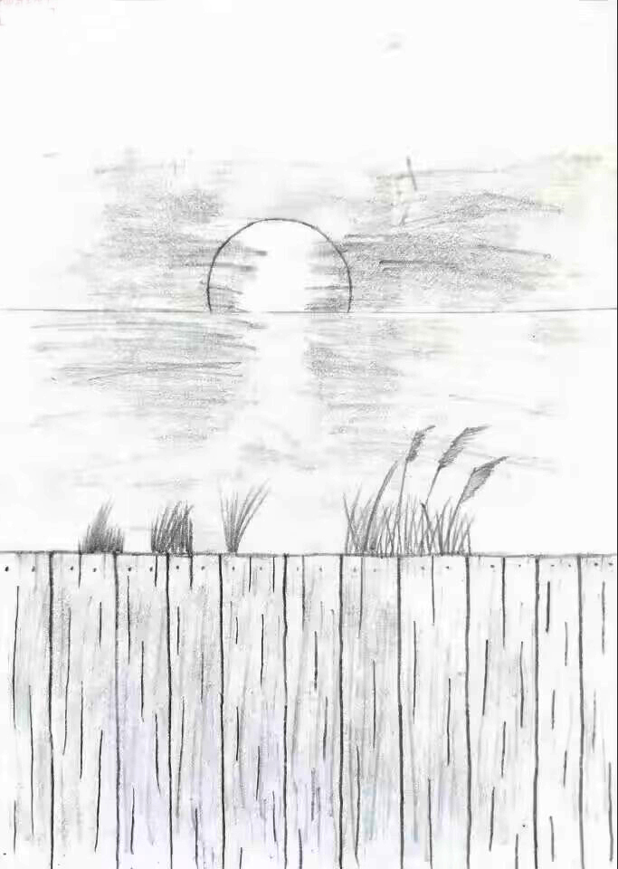 大家好!我画的是《湖畔落日宁静景》。你看,太阳在湖面上慢慢落下,水面波光粼粼的,旁边的草随风轻轻晃。还有木栅栏,把这美景框得好好看。在这里,感觉时间都变慢了,超宁静的。每次看到这样的落日,就觉得心里暖暖的。欢迎大家来看看这湖畔的落日,保证你会被这宁静的美打动哦!