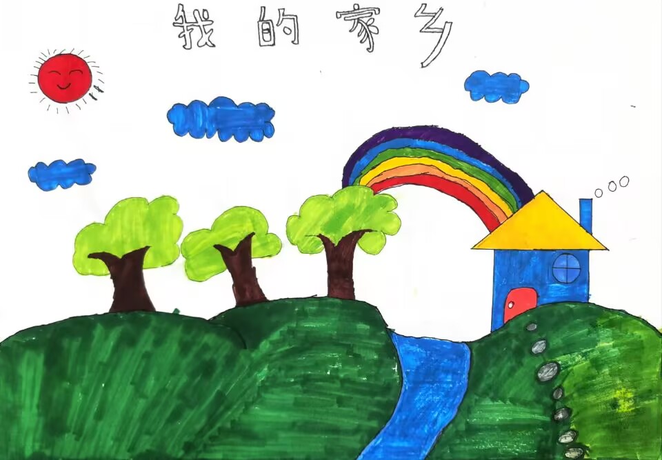 大家好!我画的是《家乡彩虹童话园》。我的家乡有红红的太阳,蓝蓝的云朵,还有漂亮的彩虹。绿绿的山坡上长着大树,蓝色小屋旁边有条小溪流。每次看到彩虹,就觉得家乡像童话世界一样。欢迎大家来我的家乡玩,看看彩虹,逛逛童话园,保证你们会爱上这片充满色彩的地方哦!