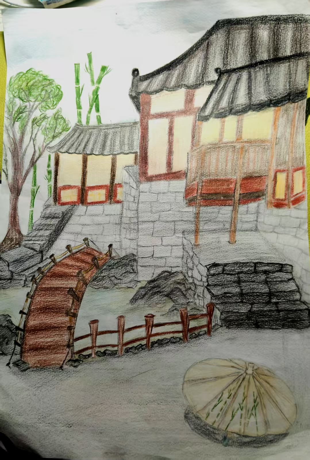 这幅画的主要创作理念出自于小河流水人家这句诗,饱和度较高的色彩,丰富的图景,这幅画的景色来源于在一次旅游中的美景,其中不但包含了古镇的美,还有一些想象色彩,美丽的古镇,清澈的河水,展现出了自然之美,这不正是人们内心所想要的吗?