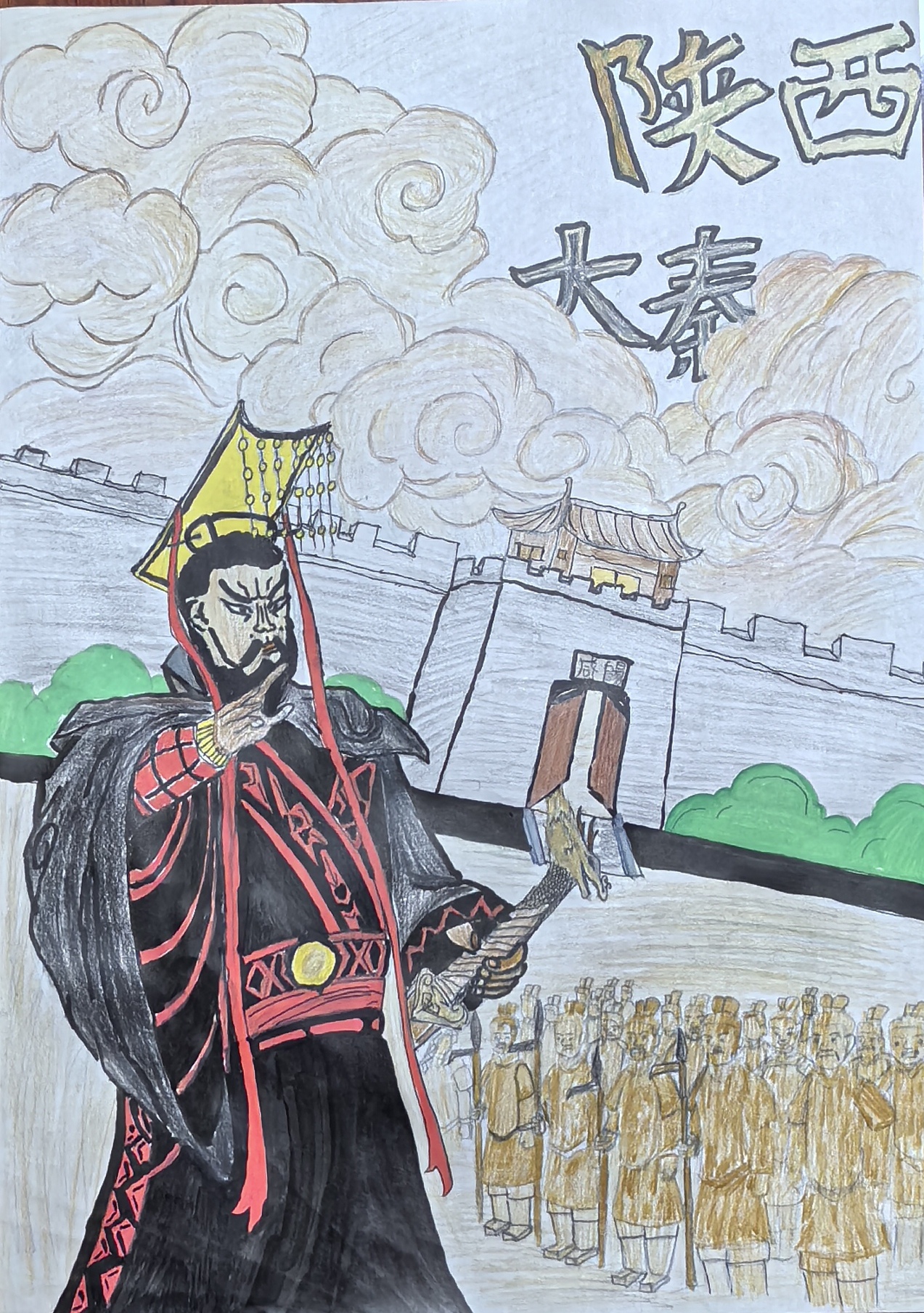 这幅作品以"大秦帝国"为核心,旨在展现秦王朝的雄浑气魄与历史底蕴。创作者选取秦始皇这一标志性人物,他头戴冕旒、身着华服,手持象征权力的器物,尽显帝王威仪。背景中的古城墙、城楼呼应陕西的历史地标,兵马俑军阵则凸显大秦军事与文化的震撼力。通过对服饰细节、建筑风貌的刻画,融合历史元素与艺术表达,传递出对大秦帝国统一伟业、制度创新的敬意,让观者在画面中回溯那段波澜壮阔的历史,感受陕西作为秦文化发源地的深厚底蕴。