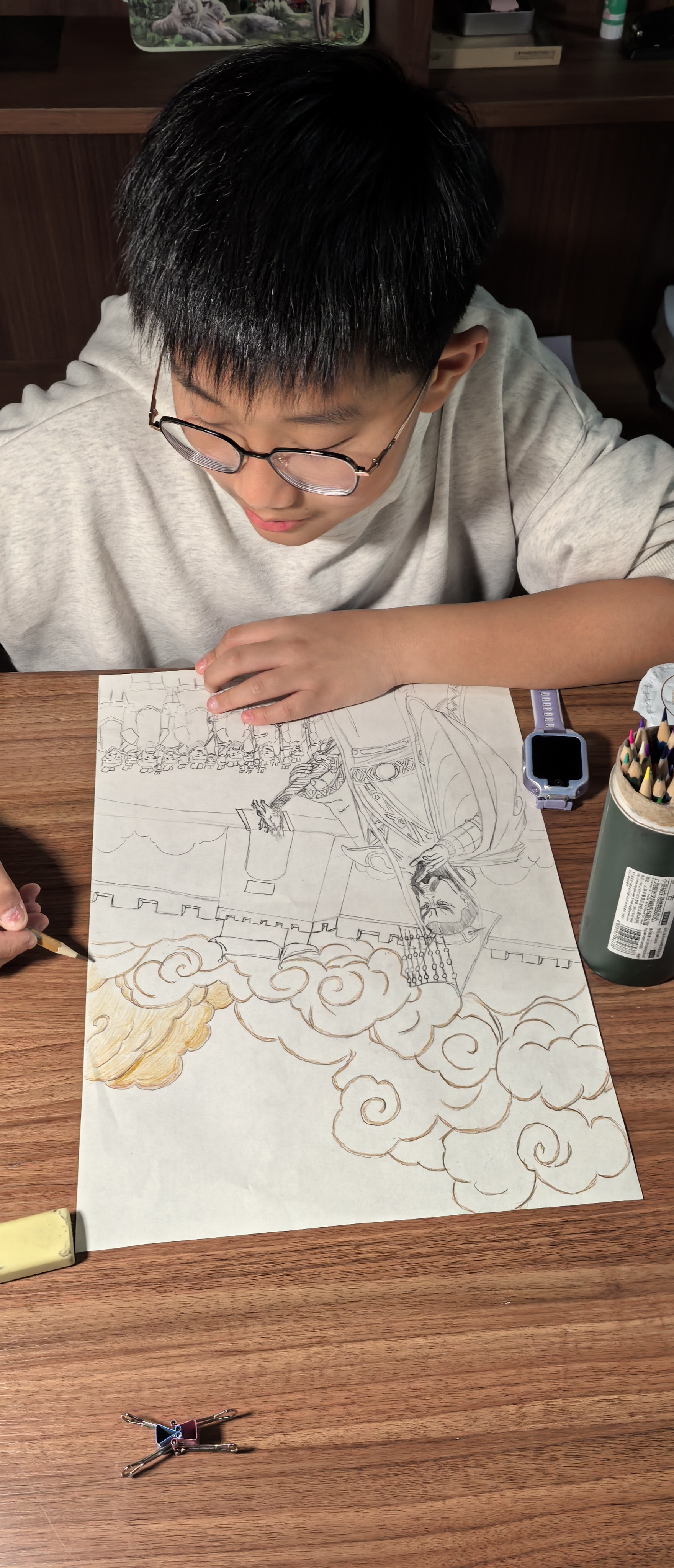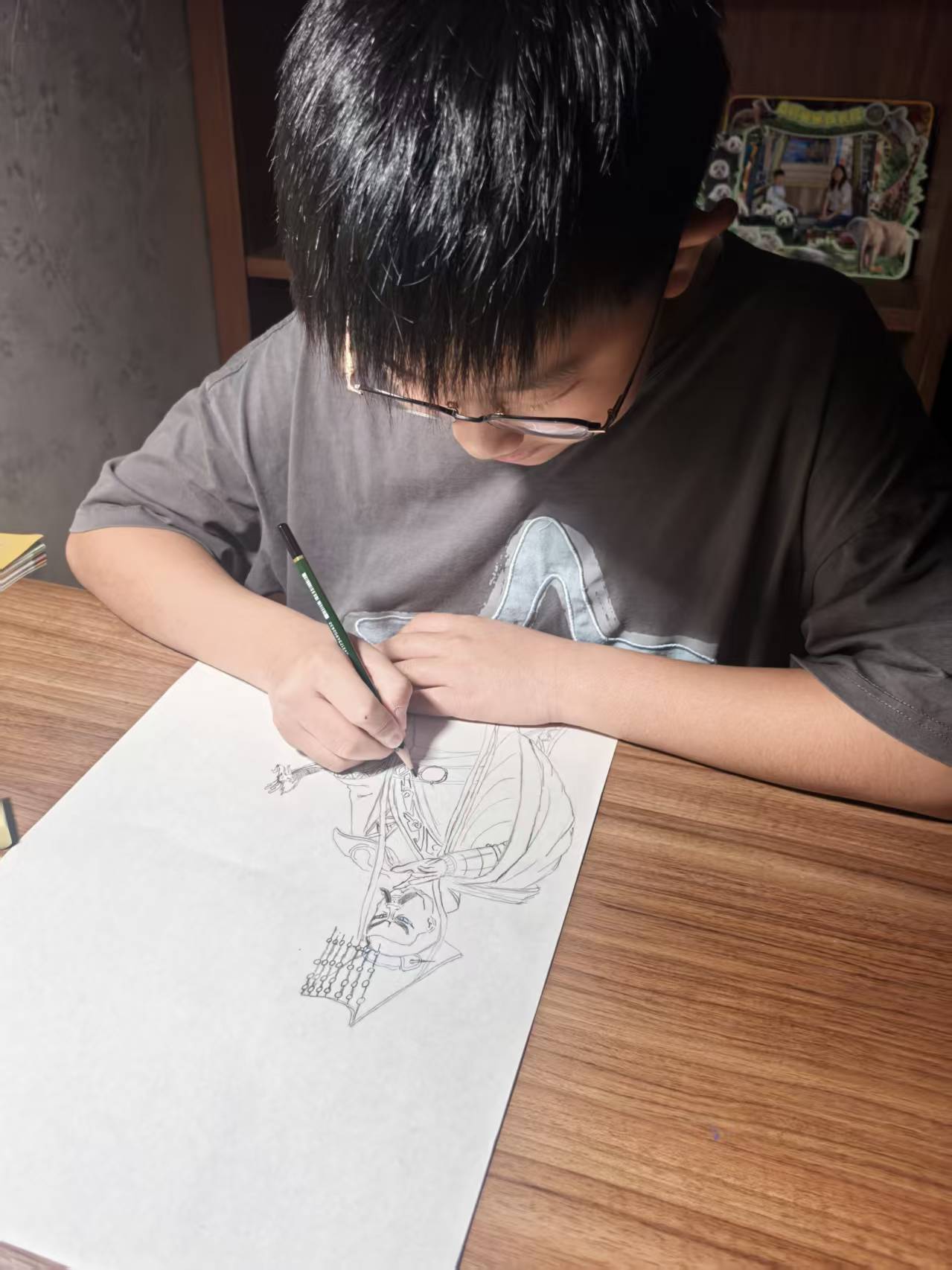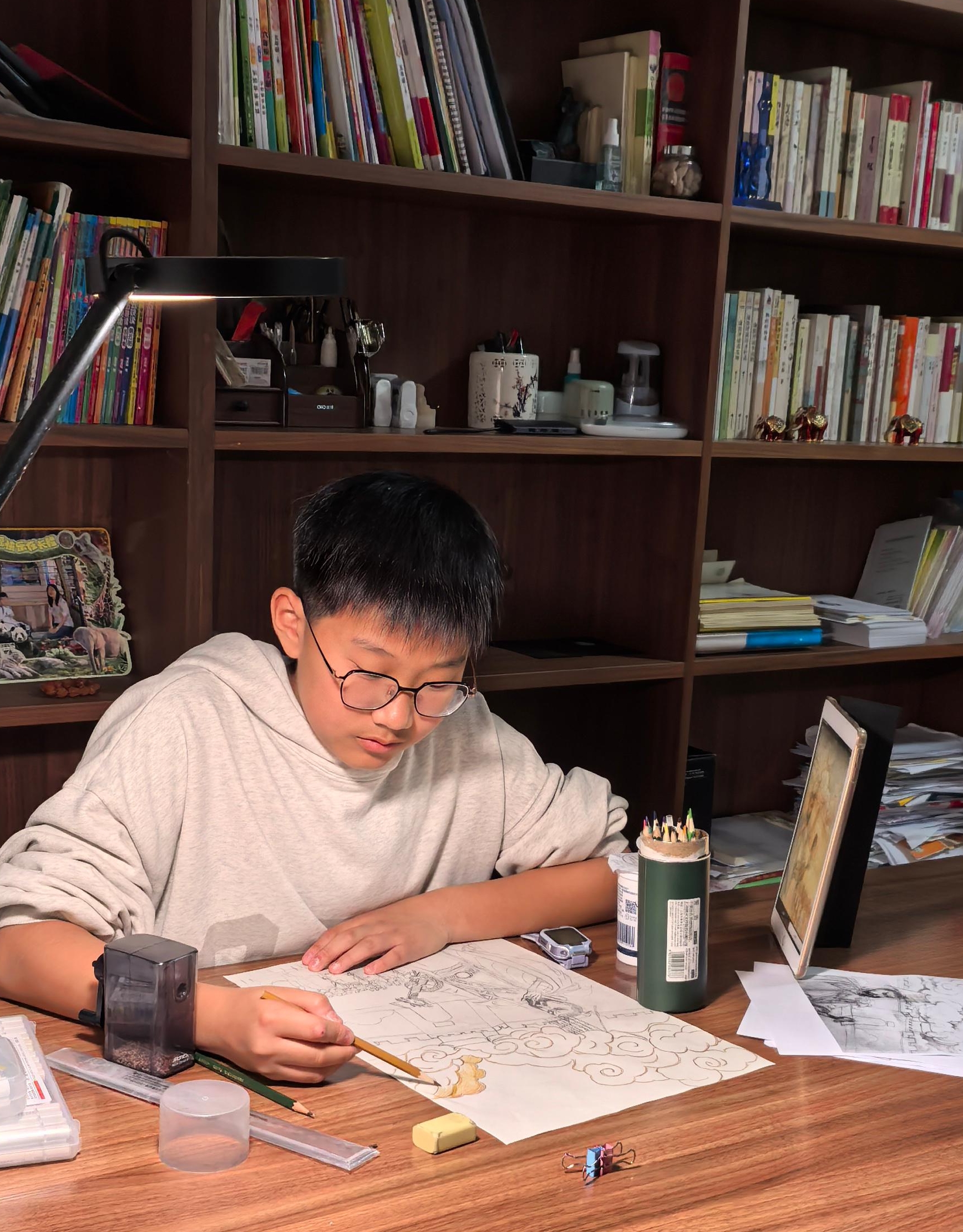 在满是书籍的静谧空间里,杨嘉树同学专注地沉浸于绘画创作。桌上的画笔、橡皮等工具整齐摆放,他眼神专注,在纸上勾勒线条,仿佛在构筑属于自己的艺术世界。四周的书架与小摆件,为这专注的创作时刻增添了几分温馨与雅致。