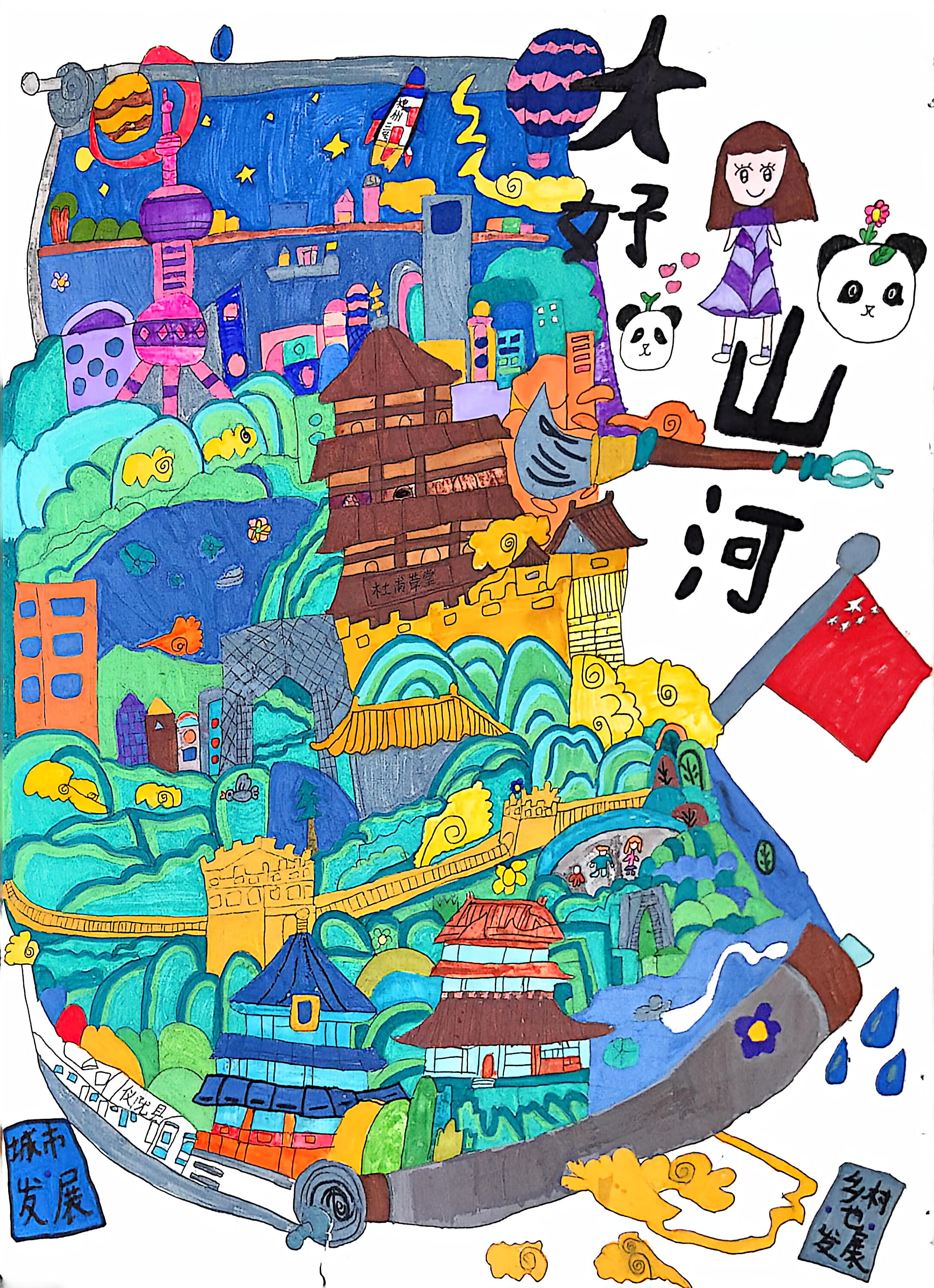 这幅画作以卷轴为载体,定格城乡协同发展的鲜活图景:卷轴之内,现代城市建筑与自然山水巧妙相融 —— 摩天大楼的玻璃幕墙映着蓝天,旁侧青山如黛、碧水蜿蜒,绿树沿城市街道舒展,高架桥梁横跨河岸,全无城乡割裂感。 笔触细腻而生动,既绘出城市发展的现代活力,也留存乡村山水的自然灵韵,将 "城在景中、景随城展" 的和谐画面凝于卷上,尽显新时代城乡共生共荣的美好愿景
