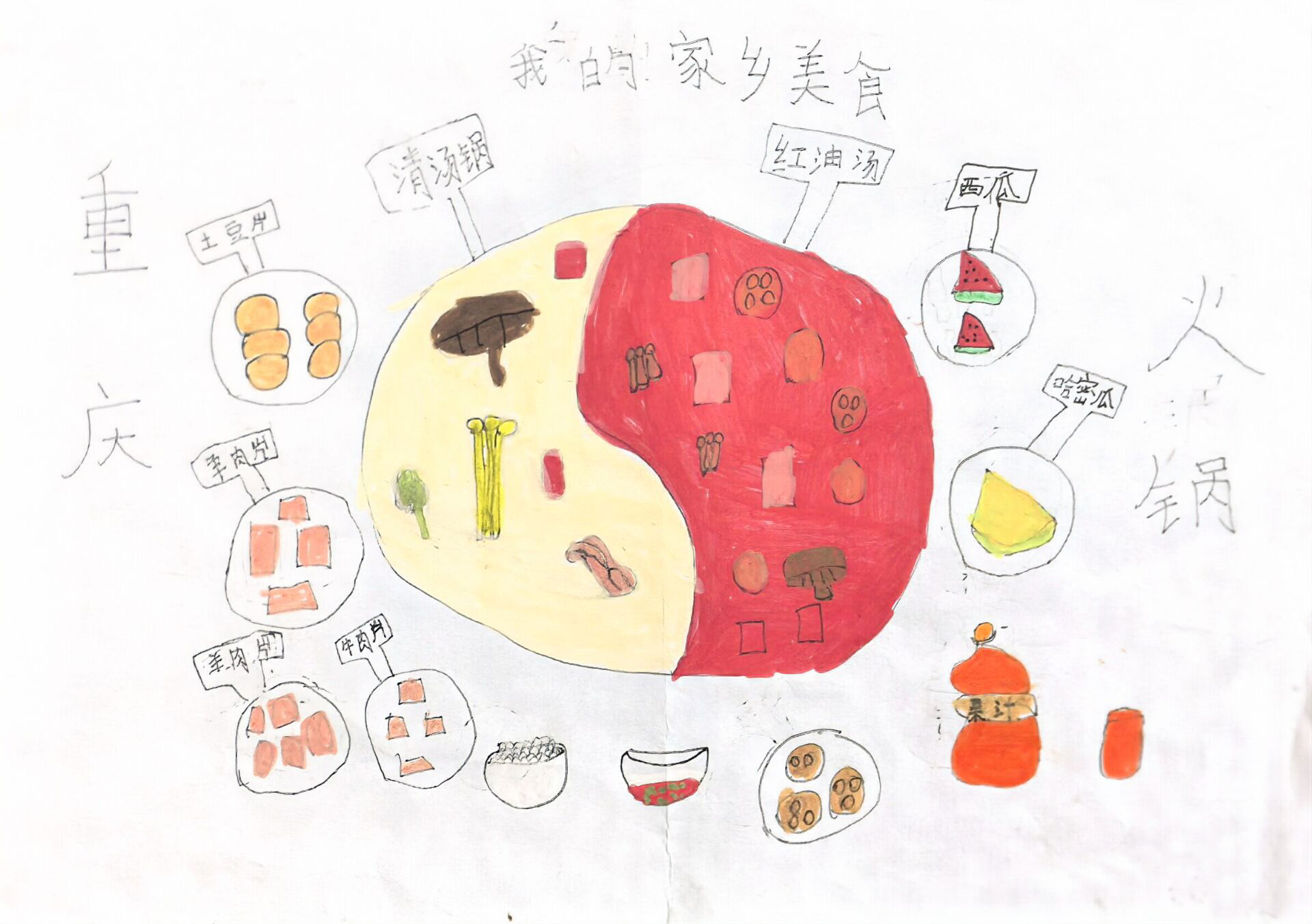 大家好!我画的是《重庆火锅家乡美食》。你看,有清汤和红油的火锅,周围还有土豆片、牛羊肉片,吃完火锅再吃西瓜、哈密瓜,超爽!重庆火锅是我家乡的特色,又麻又辣特别香。每次和家人吃火锅都很开心,感觉家乡的味道最棒。欢迎大家来尝尝重庆火锅,保证你们会爱上这片充满美味的家乡小天地哦!