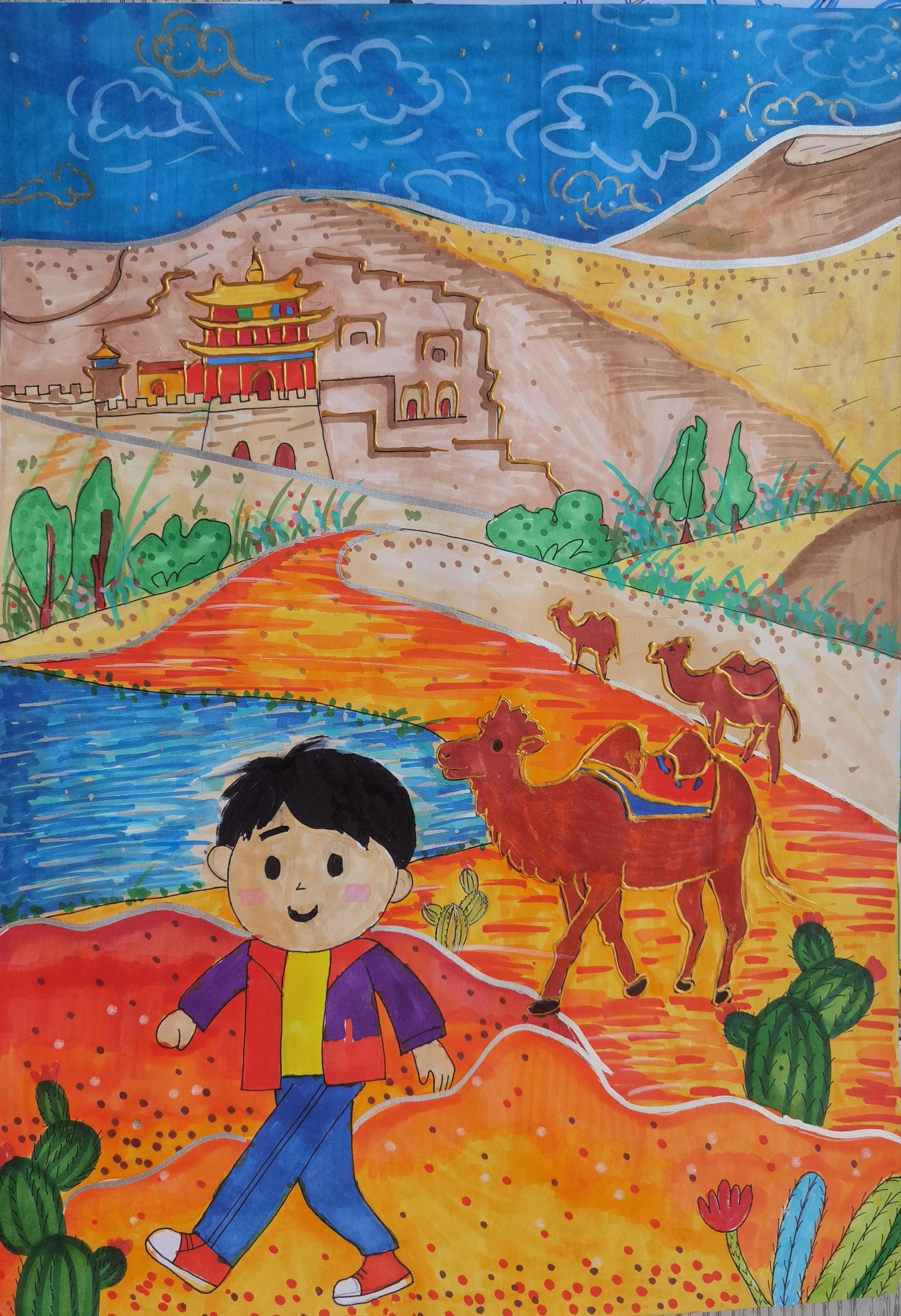 这幅画聚焦"丝绸之路"的文化内涵,以西北丝路沿线的地标建筑、地域景观为载体,通过现代探索者(卡通人物)与丝路传统元素(骆驼、古建)的融合,展现丝绸之路作为历史文化纽带,在当代仍具有的探索价值与文化魅力,传递对丝路文明传承与发展的关注。希望通过这幅画,让观者感受到丝绸之路不仅是历史上的贸易通道,更是承载着多元文化、地理奇观的"文化长廊";同时以现代人物的视角,唤起大众对丝路文化遗产的关注,体会古今文明在这片土地上的对话与延续。