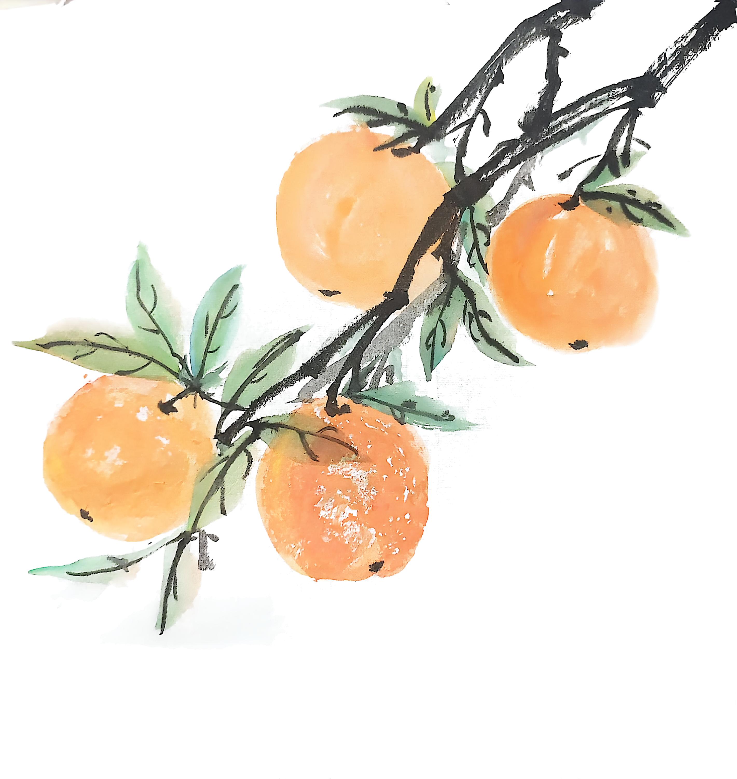 这幅国画以橘枝为景,墨枝苍劲,绿叶鲜活,金橘饱满。画家以水墨为语,用浓淡色彩绘出果实的鲜亮与枝叶的灵动,留白衬出画面的简洁通透。金橘寓意吉祥,满枝果实似在诉说丰收喜意,尽显传统水墨"托物寄情"的韵味,给人以明快、美好的视觉与心灵感受 。