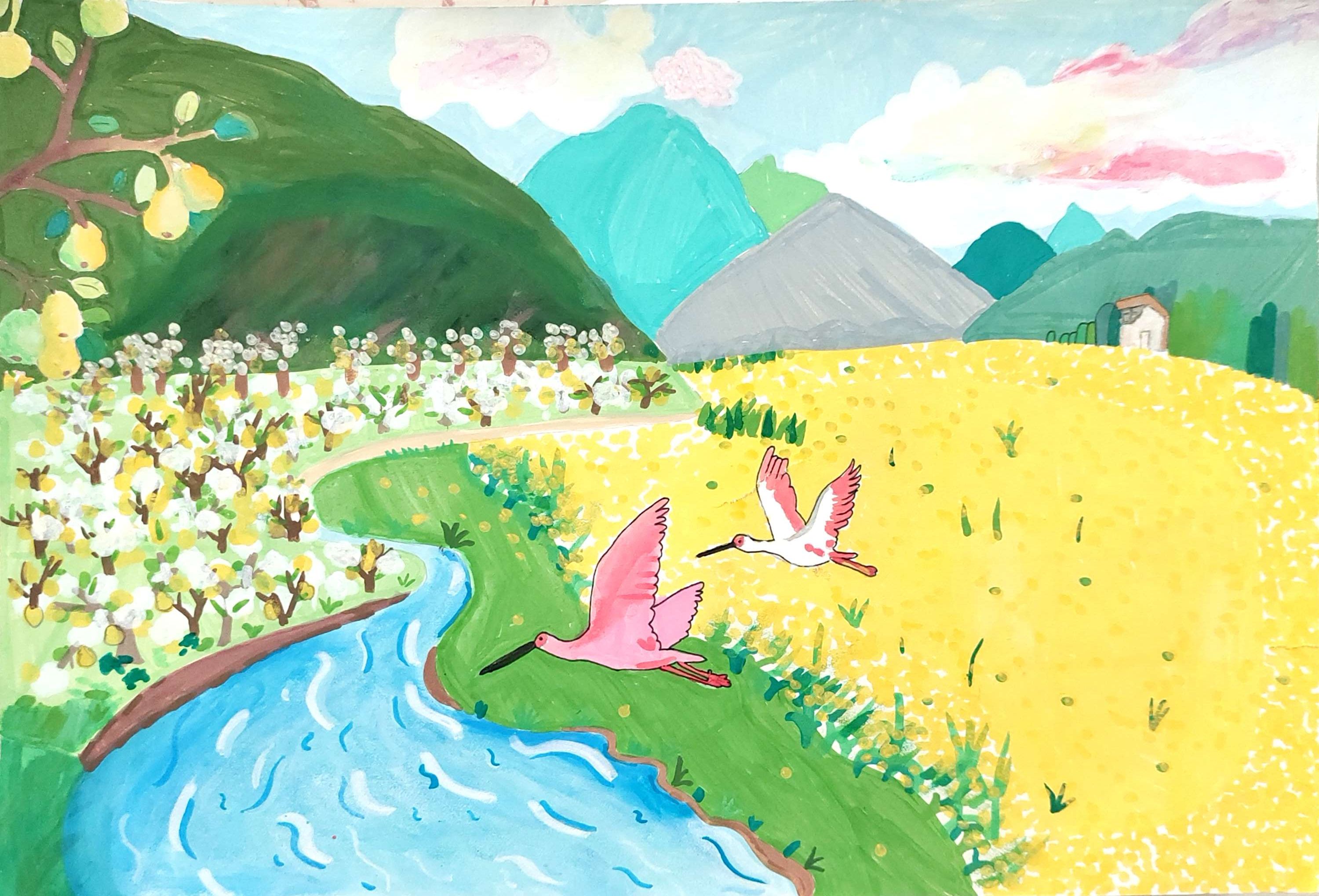 《朱鹮伴春归》 这幅画呈现春日生态图景,清澈溪流、金黄花海是朱鹮的家园。它们振翅翱翔,身旁果树挂果、繁花盛开,远山环抱。展现自然环境之美,也让我们看到朱鹮等生物与春日田园共生的和谐,传递守护自然的深意 。