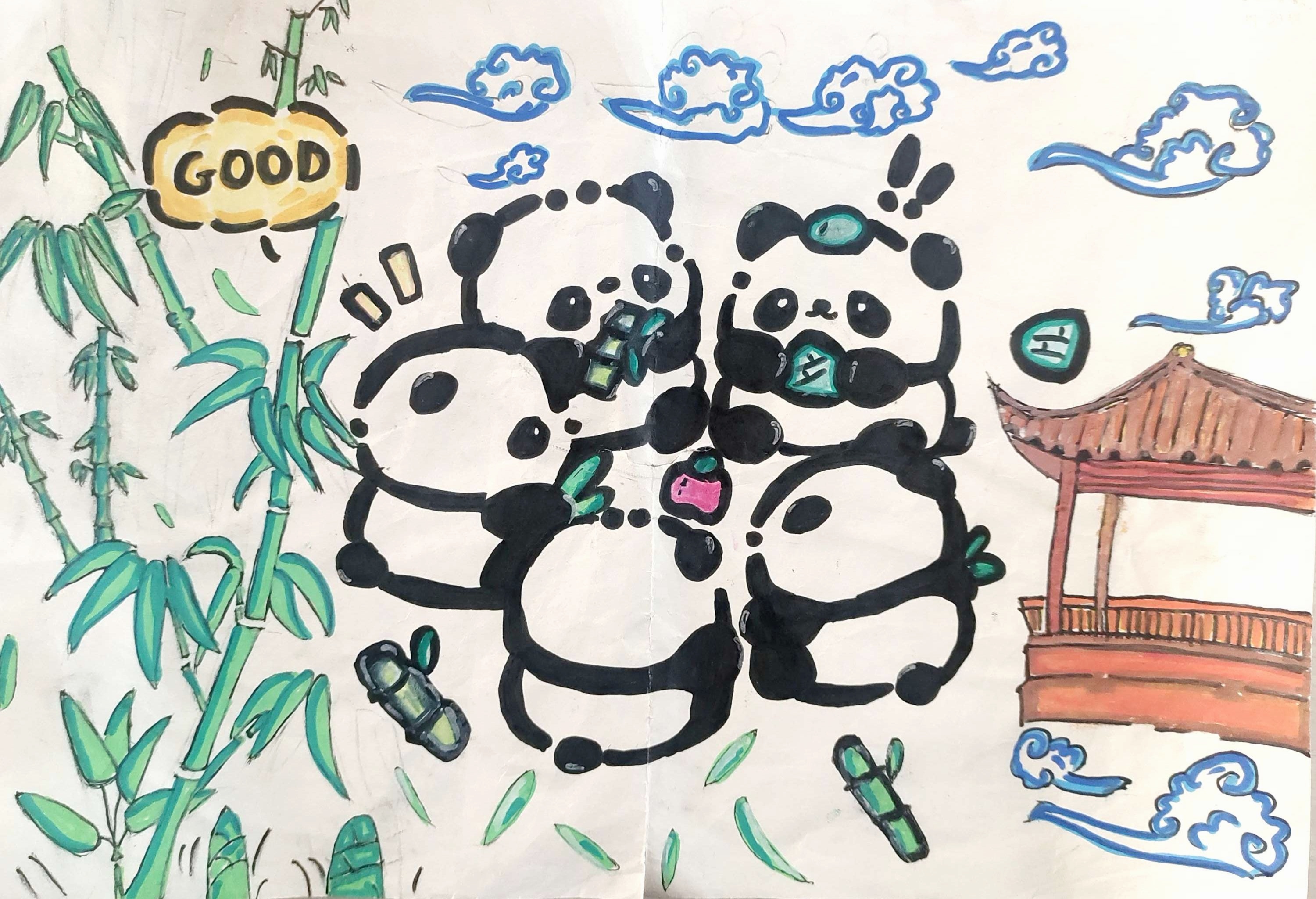 《熊猫乐园:古韵竹林欢歌》 这幅画展现了一群憨态可掬的熊猫在古韵场景中的欢乐聚会。翠绿竹林、传统建筑与灵动云朵烘托氛围,熊猫们或抱竹、或捧物,神态各异, "GOOD" 字样添活泼感,将国宝的可爱与中式美学融合,传递出轻松愉悦、充满童趣的氛围,尽显对熊猫与传统文化的喜爱 。