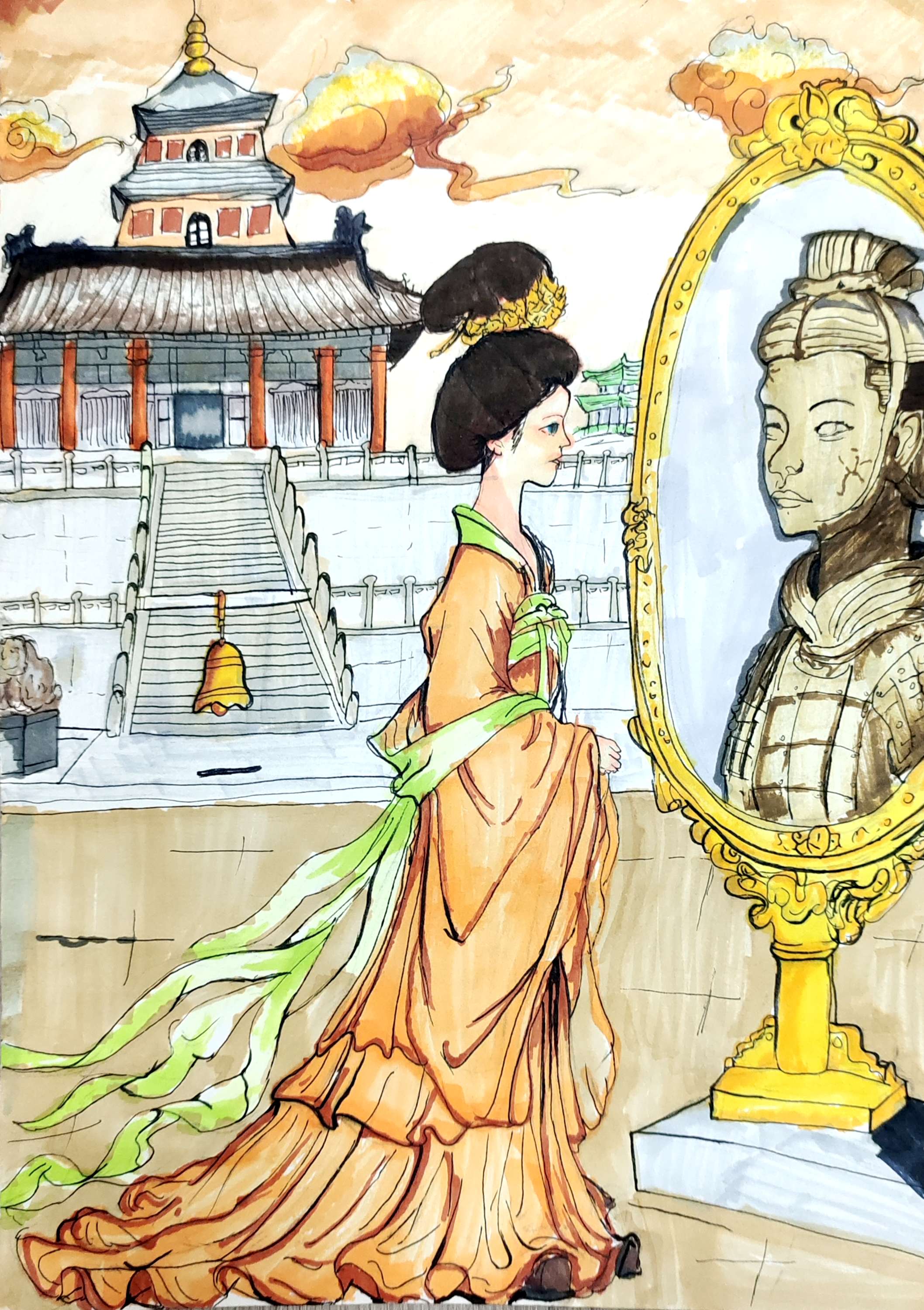 名称:《古今长安镜遇》 这幅画以独特视角展现西安的时空交融。唐装仕女临镜,镜中映出兵马俑,古今对话由此展开。背景里,古建巍峨,钟楼的轮廓诉说历史厚重。创作者借镜面连接时空,让唐代的柔美与秦代的雄浑碰撞,色彩明快又不失古韵,传递出西安作为十三朝古都,承载的千年文化传承与历史层叠,每一处笔触都在讲述这座城市古今交织的独特魅力,邀观者共赴一场跨越时空的长安之约 。
