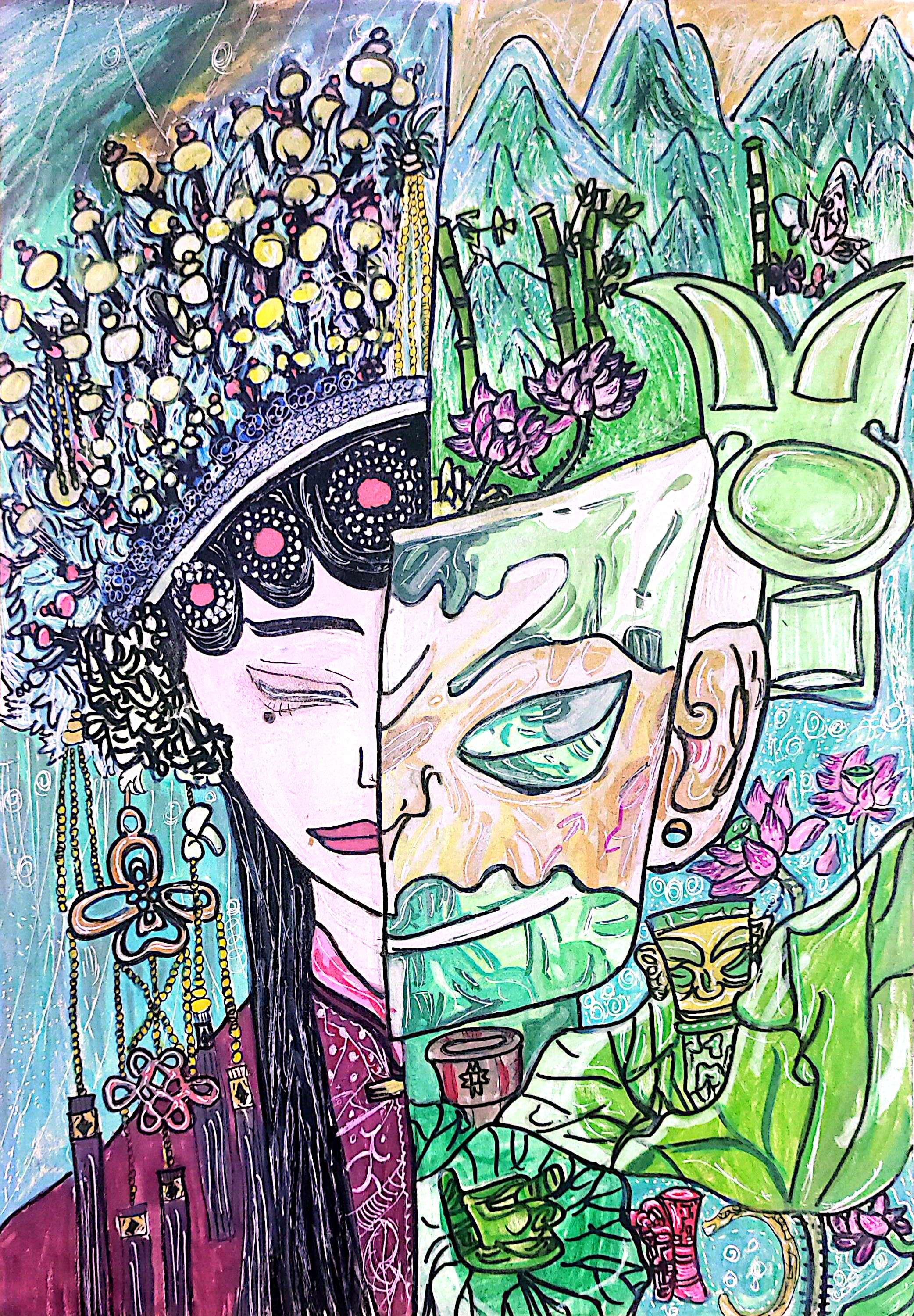 名字:《古韵新象 · 双面观》 这幅画以独特双面构图,展现传统与创新融合。一侧是头戴华丽戏曲凤冠的古典女性,精致头饰、服饰尽显国粹韵味;另一侧用奇幻色彩、抽象造型,融入山水、青铜器等元素,碰撞出先锋艺术感。借 "双面" 形式,串联戏曲传统与现代艺术,以斑斓色彩、细腻笔触,诠释对文化传承与创新的思考,呈现传统美学在当代艺术语境下的新生 。