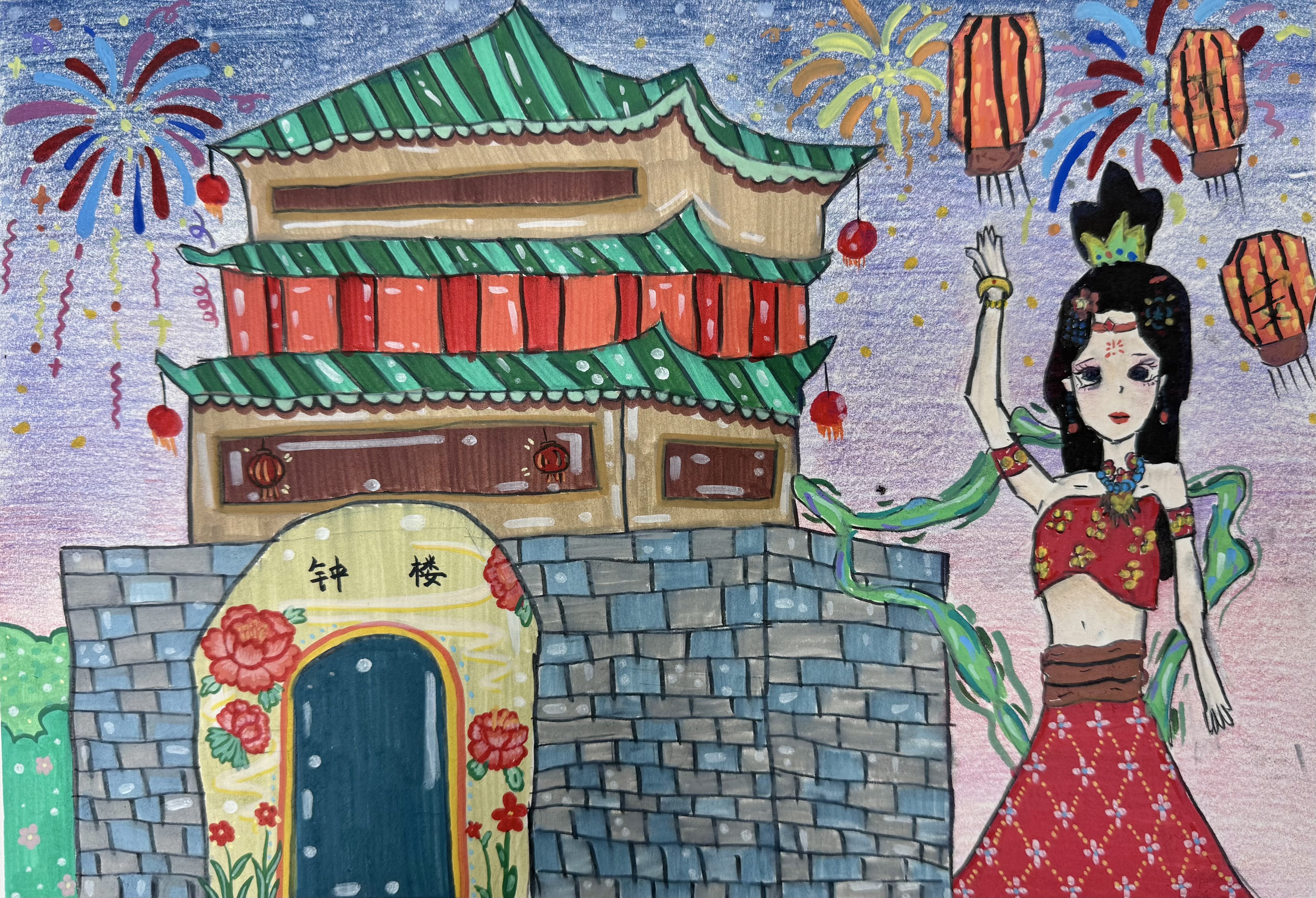 这幅画的创作理念,是以西安钟楼为核心载体,融合古城文化符号与盛唐意象,画中钟楼还原了其“重檐三滴水”的明代建筑形制——青绿琉璃瓦、朱红门扇,同时加入牡丹纹饰,既呼应建筑装饰的华美,也暗合盛唐雍容气质。右侧女子形象融合了西安“盛唐文化”的符号——红裙、飘带借鉴唐俑服饰,让静态建筑与灵动人物形成“古今对话”,暗合西安“千年古都”的时空感。烟花、红灯笼是西安年俗的经典元素(如钟楼下的长安灯会),画中用漫天烟火与悬挂灯笼,传递西安“年味儿最浓”的城市记忆。整体以“钟楼为核、民俗为韵、盛唐为魂”,用童趣画风将西安的地标、年味、历史气质浓缩于一画,既是对古城的直观呈现,也是对其文化魅力的浪漫诠释。