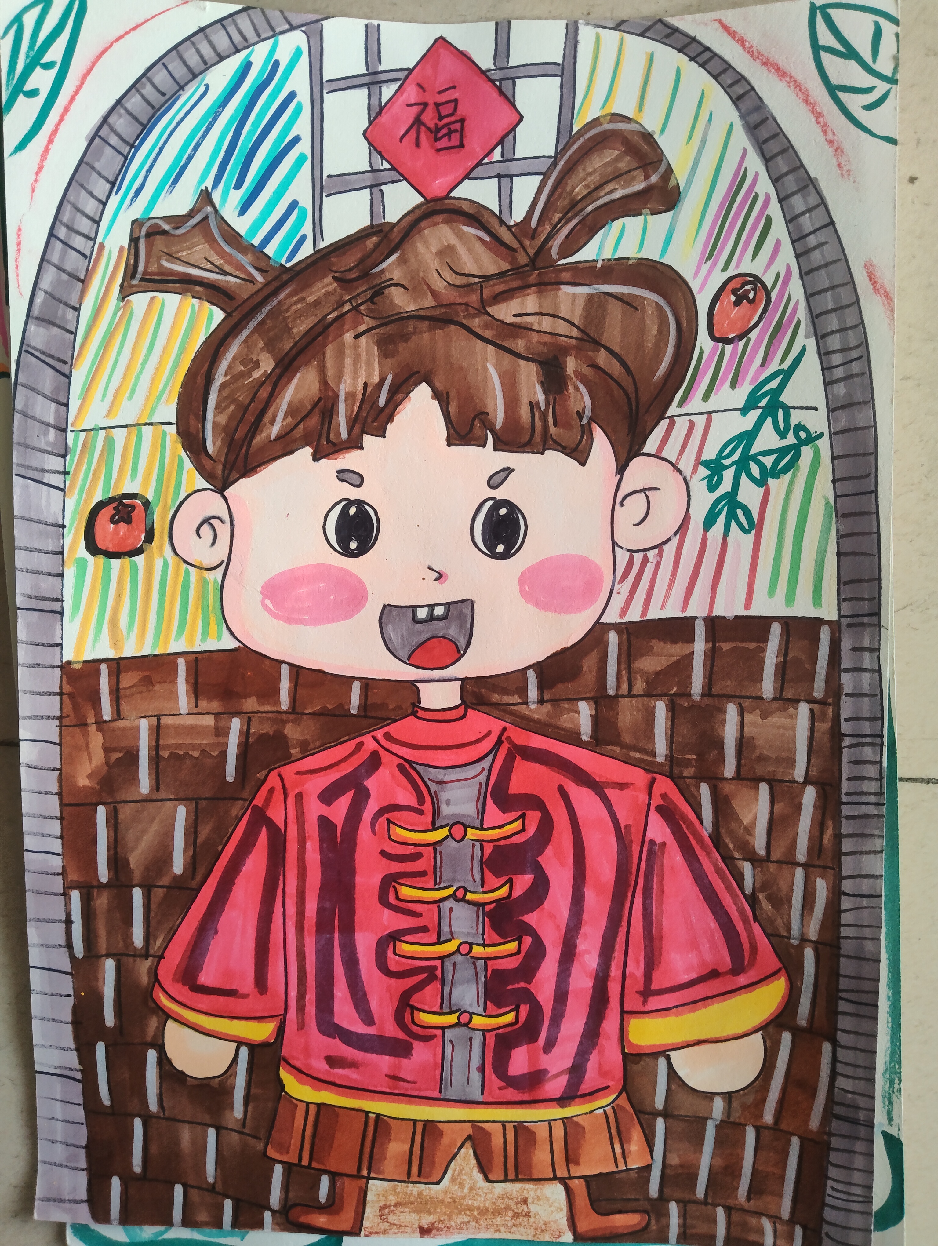这是一幅充满年味的卡通手绘,画面核心是个可爱的孩童形象:孩子梳着双丫髻,圆脸蛋带着腮红,咧嘴笑得特别开心;穿着红色中式对襟上衣(配黄色盘扣、镶边)和棕色下装,是传统喜庆装扮;背景是带"福"字的拱形门(门上还有小装饰),墙面是棕色砖瓦质感,整体色调温暖又热闹,透着浓浓的节日氛围。