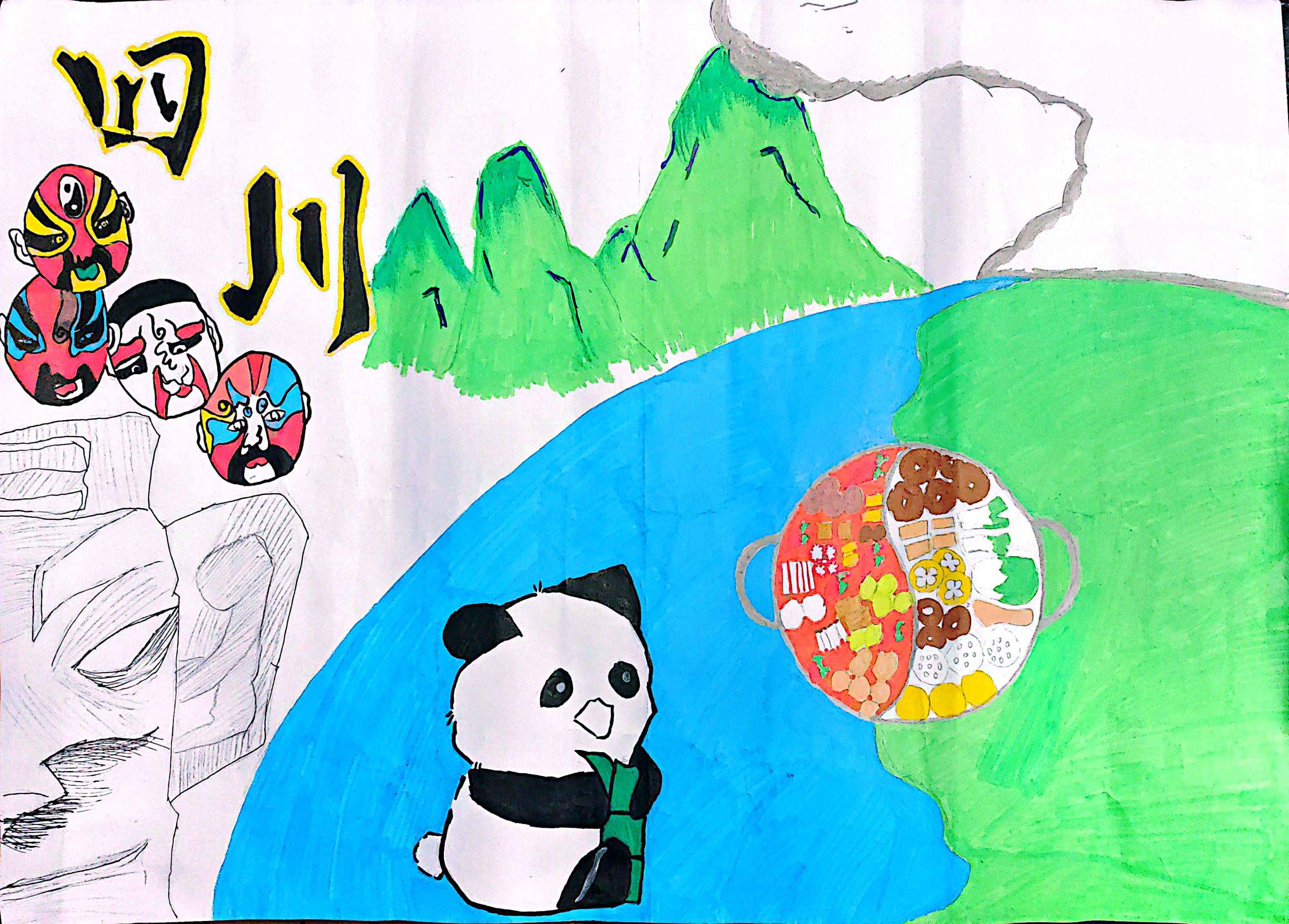 这幅画以“四川”为核心,用脸谱体现川剧文化、熊猫代表地域标识、火锅承载烟火生活,搭配青山绿水呼应四川“天府之国”的自然底色,左下角轮廓暗合三星堆元素。整体用明快色彩串联文化符号,既展现四川的自然灵秀,也传递其人文烟火气,让家乡特色在画里鲜活起来。