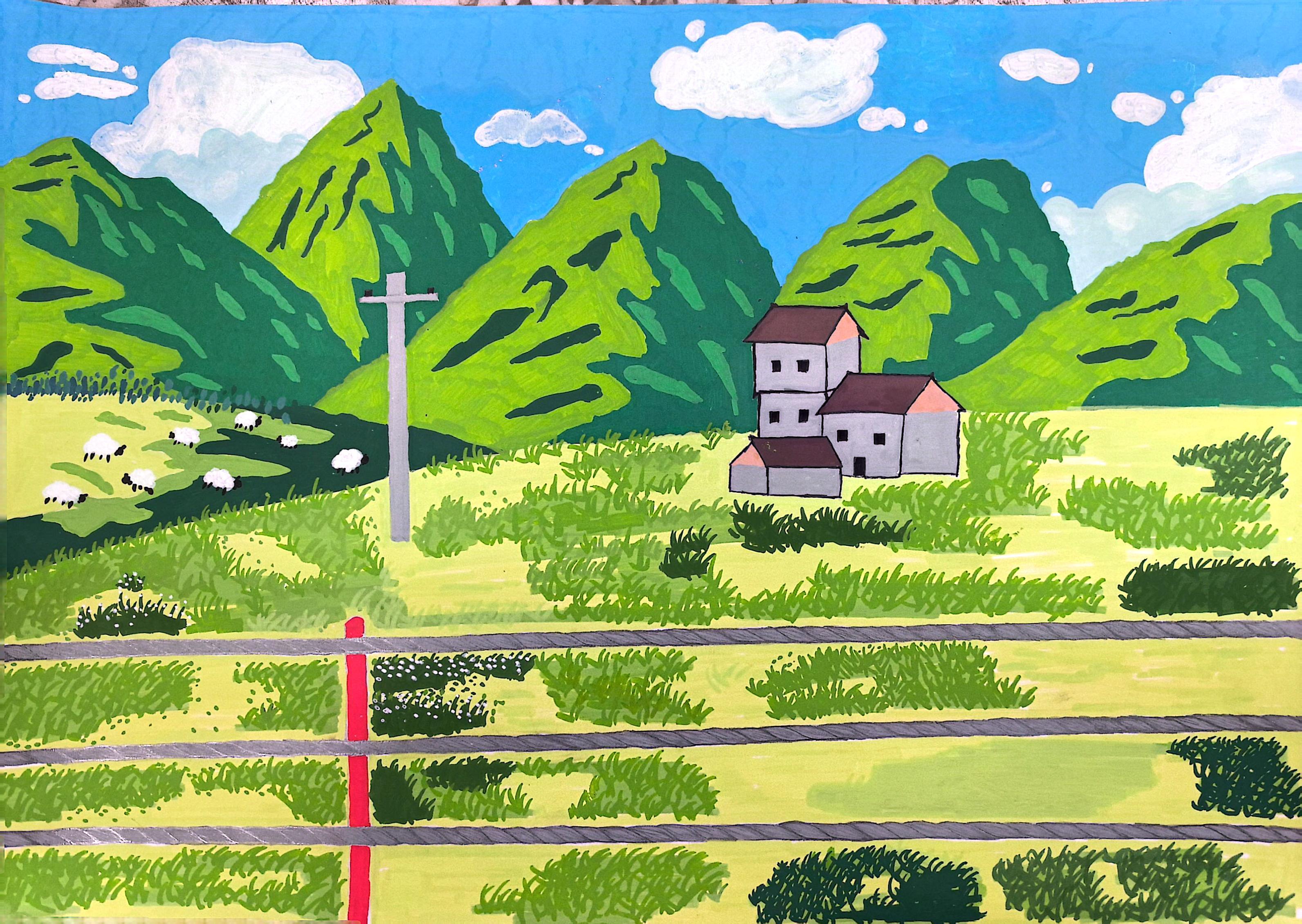 这张画的灵感是来源于在一次去草原旅游,给我的感受很深。去到那里时,整个山坡和草坪都是绿油油的,天空也是深蓝色的,随着时代的发展,城市的天空总是给人一种灰蓝灰蓝的感觉,有一种压抑感而在草原上,蔚蓝色的天空,鲜绿色的草地,没有太多的汽车尾汽排放空气也充满着青草味,让人在不断发展的工业到处都是高楼大厦的时代,还能发现如此美丽的风景也是难得.所以就想有绿一点的颜色去画出那些绿意,也想让人们知道在发展公业的同时,也要重视保护自然环境。