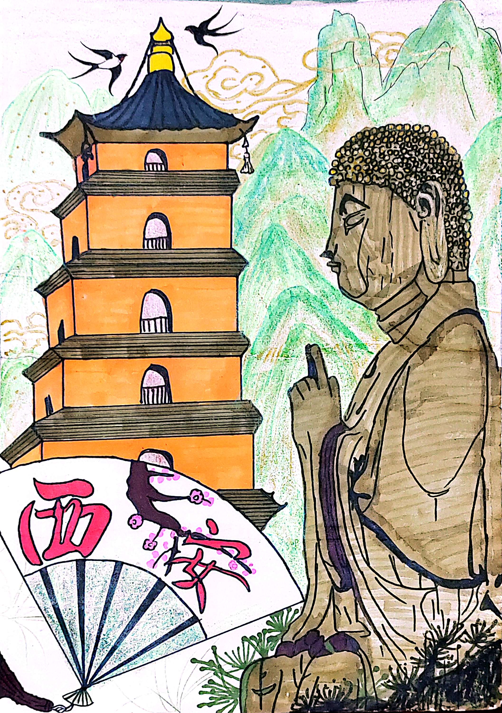 《长安古韵绘卷》 这幅画聚焦西安,将大雁塔、佛像等标志性元素融合。古朴佛影静立,雁塔巍峨,"西安" 折扇添市井烟火,飞燕、青绿山水衬古韵。用童趣笔触串联历史与当下,绘出西安厚重文化底蕴,让千年古都的魅力,在色彩与线条间流淌,带观者沉浸式感受这座城市独特的时空交融之美 。