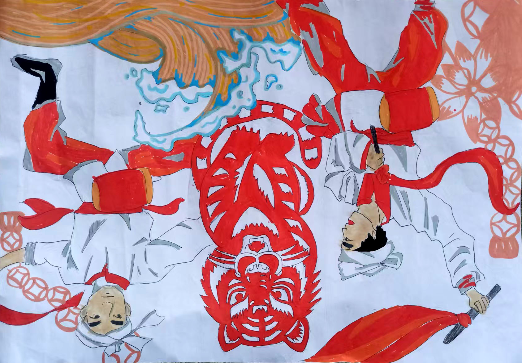 作品融合安塞腰鼓、黄河波涛、陕北老虎与剪纸元素,以奔放笔触与浓烈色彩,展现黄土高原的生命力量。腰鼓的激昂、黄河的磅礴、老虎的雄健与剪纸的质朴交织,象征陕北人民坚韧不拔的精神与对美好生活的热爱,传递出中华传统文化的深厚底蕴与时代活力。