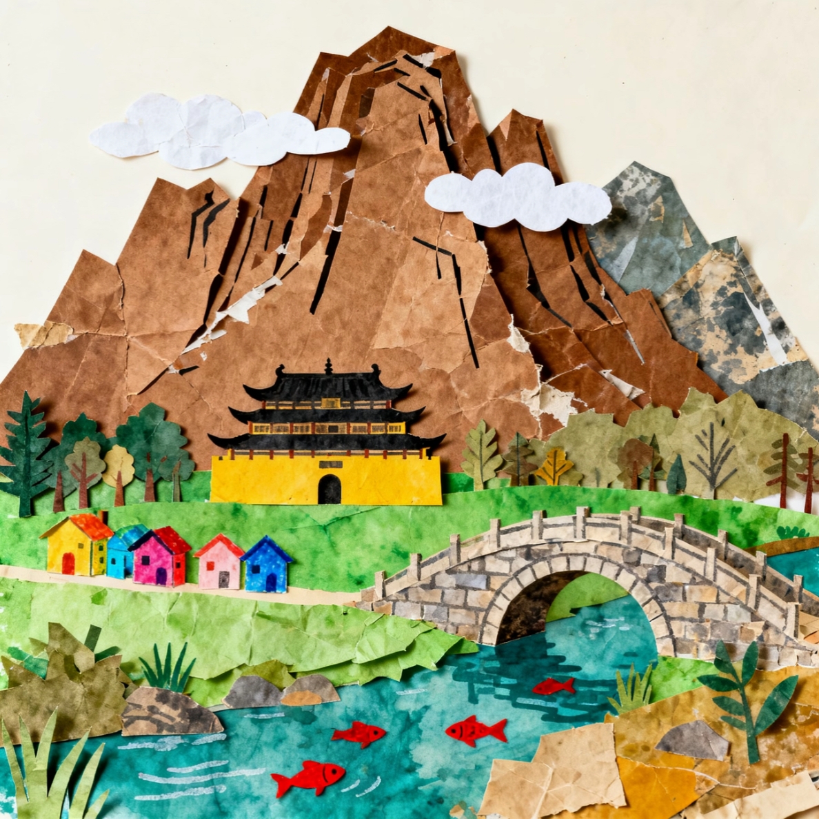 以剪纸拼贴的肌理,重构中式山水的意境:褶皱的牛皮纸摹拟山峦的苍劲,水彩晕染的绿水托着石桥,明艳的彩纸民居与黛瓦黄墙的古建相衬,让传统水墨的“烟岚气”,在手工拼贴的质感里变得可触可感。 它并非复刻古画,而是用纸张的“碎与叠”,把山水、古建、人家揉成鲜活的日常——就像把记忆里的江南意趣,拆解成一张张彩纸,再拼贴成触手可及的烟火桃源,让传统美学在手工温度里长出新的生动。