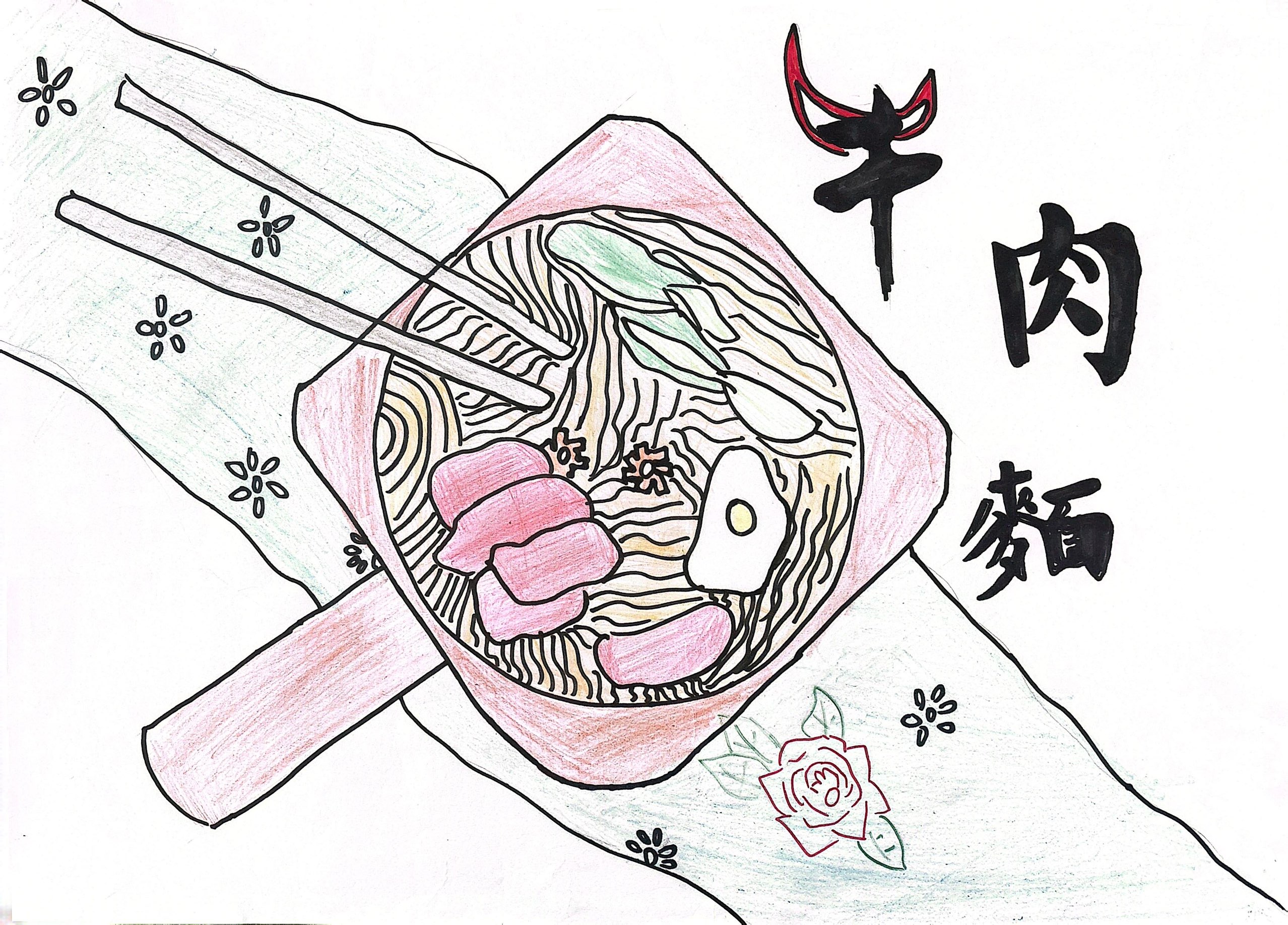 这幅作品以"牛肉面的烟火与地域符号"为核心,聚焦兰州牛肉面这一地域美食的日常温度:碗中筋道的面条、鲜嫩的牛肉、溏心蛋,是牛肉面的经典食材组合,还原了它"汤清味浓、料足味美"的味觉记忆;筷子与手绘的碎花元素,则增添了生活的松弛感,让美食从"食物"变成了承载日常烟火的载体。 右侧"牛"字搭配牛角符号,既点明"牛肉面"的核心食材,也暗合兰州"牛肉面之乡"的地域标签,让美食与城市文化轻轻勾连。 创作意图是"以画尝味":用明快的色彩与具象的食材细节,把兰州牛肉面的"香、鲜、暖"转化为视觉语言,让观者从画面里,触碰到这碗面里藏着的城市烟火气——它不只是美食,更是兰州人日常里踏实的温暖与生活的滋味。