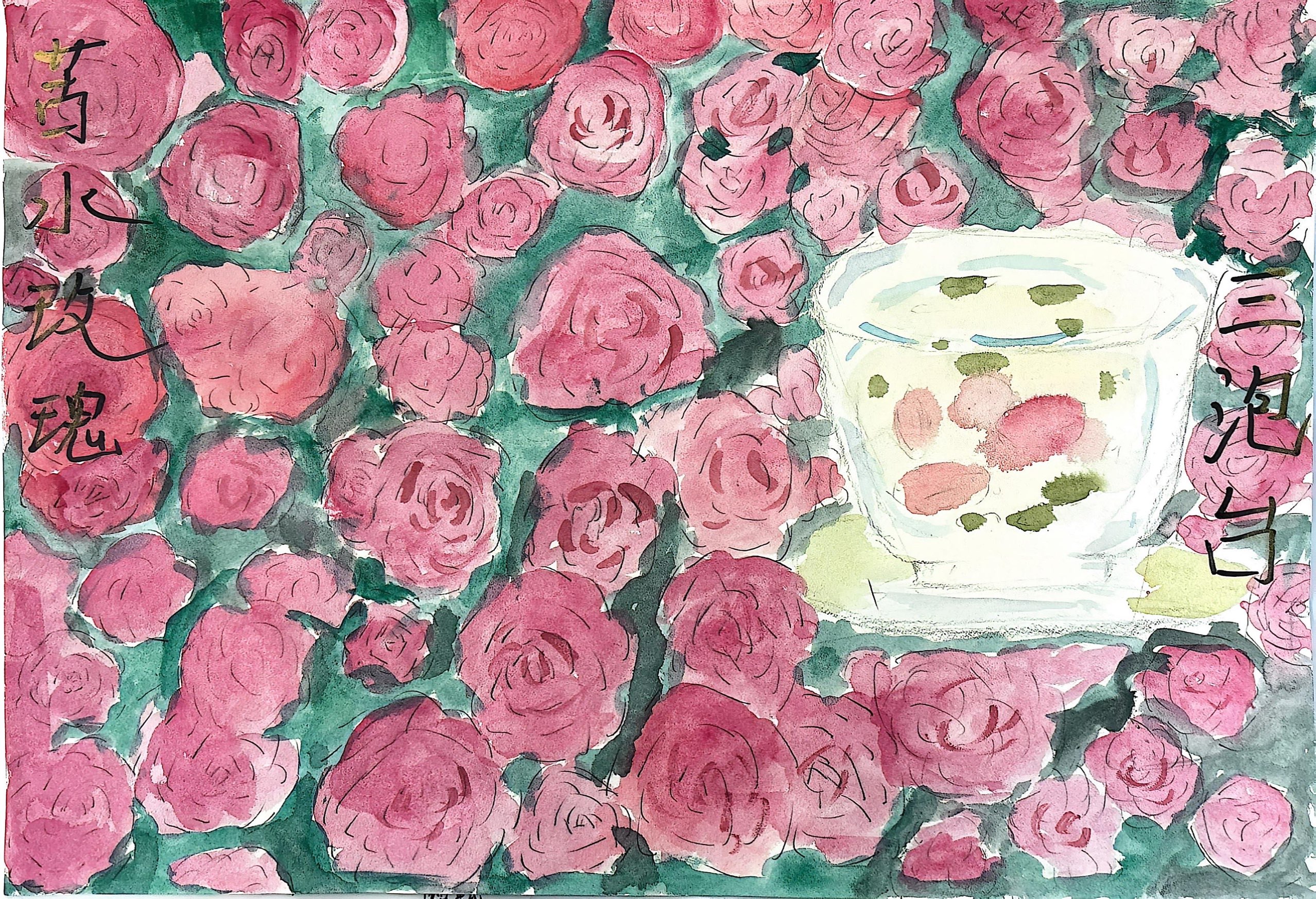 用密集的粉色玫瑰铺满画面,营造出被花香包裹的沉浸式氛围,水彩的朦胧质感弱化了现实边界,让"花"从具象景物变成一种温柔的情绪载体。 左侧"香水玫瑰"点明花的品类,右侧"三泡台"则关联了茶饮——把玫瑰花瓣融入茶中,是将"嗅觉(花香)、味觉(茶味)"通过视觉画面结合,让静态的画有了气味和口感的联想。 生活诗意:把日常的"泡茶"放在花海中,是放大了平凡生活里的浪漫感——哪怕只是一杯加了玫瑰的茶,也能被赋予"被花簇拥"的治愈感,传递出"在日常里捕捉温柔"的生活态度。