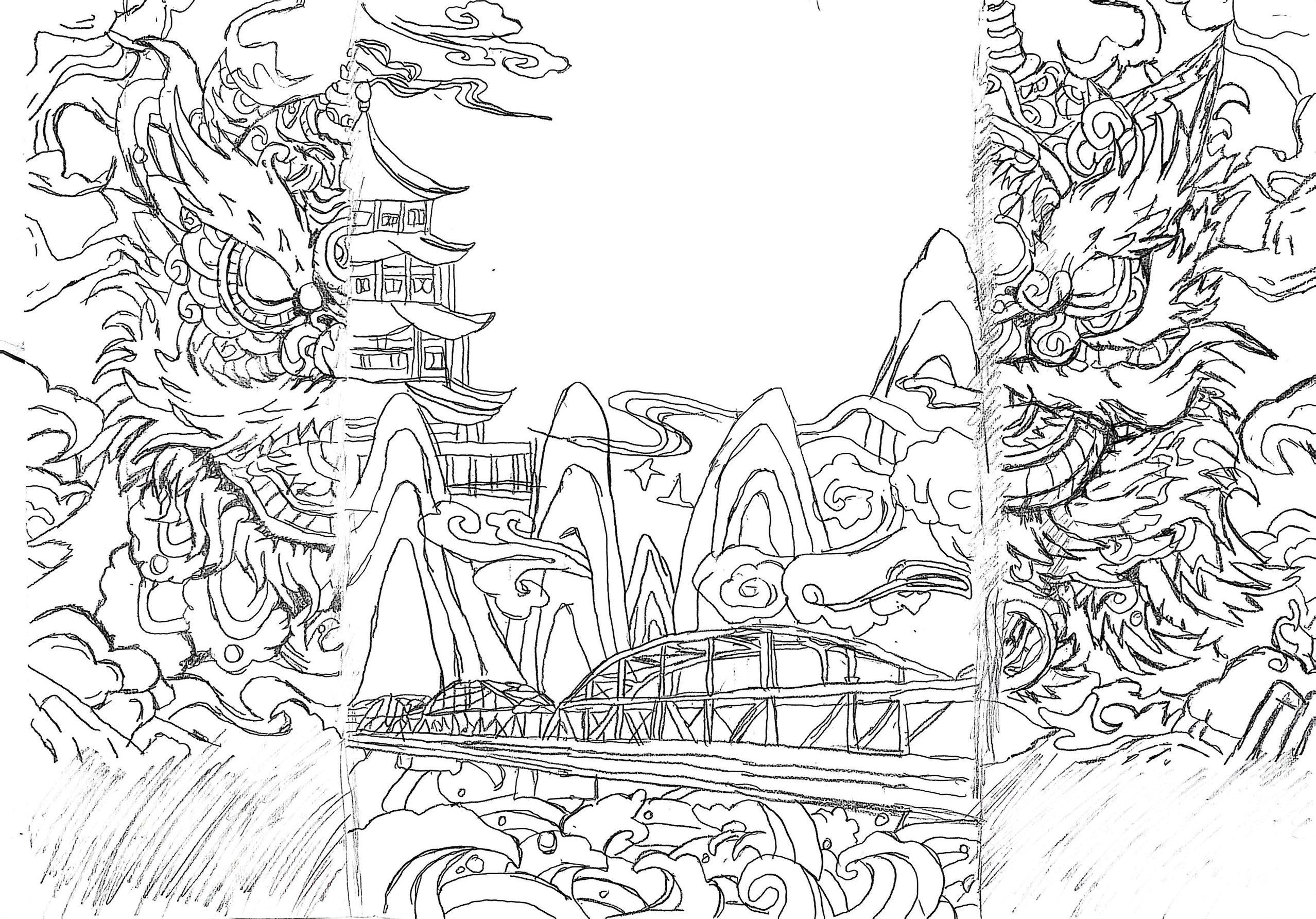 这幅作品以"古今意象的共生叙事"为核心,用线条织就传统与现代的对话:左侧虬劲的祥龙、层檐古建,是中式文化的经典符号;中间的现代桥梁,则是当代文明的具象载体,二者借云雾、山峦的线条自然衔接,消解了时空的割裂感。 创作以线描为语言,祥龙的卷曲纹路、古建的飞檐线条,与桥梁的几何结构线形成"柔与刚"的韵律碰撞,既保留传统意象的写意气韵,又凸显现代建筑的理性秩序。 作品意图是"以线连脉":把祥龙、古建代表的文化根脉,与桥梁象征的当代发展,揉进同一幅线稿里,让"传统的灵韵"与"现代的筋骨"在画面中共生,传递出文化在传承中生长、文明在新旧中延续的质感。