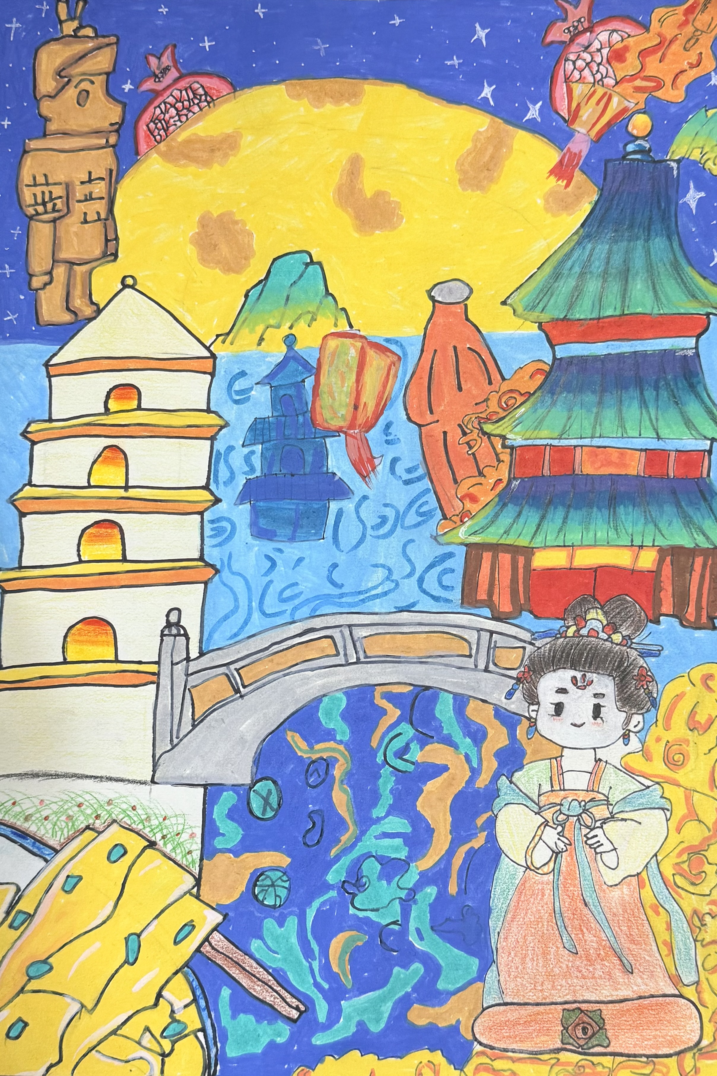 这幅画把盛唐长安的夜揉成了一场甜梦:圆月像浸了蜜的玉盘挂在星空,曲江的水裹着蓝波晃,桥边的汉服少女蹙着眉笑,连雁塔的檐、宫殿的顶都沾着月光的暖。石榴灯飘在云边,像把长安的艳都系在了星上。 我用浓彩铺出长安的柔——塔的尖、水的软、裙的飘,都是盛唐的呼吸:站在画前,好像能听见夜市的铃、游船的歌,连风都裹着桂花的香。连石狮子都蜷在月光里,成了这场梦的"守门人"。 长安的夜从不是黑的,是月光染的黄、宫灯浸的红、水波漾的蓝,裹着千年的暖,等每个想入梦的人。