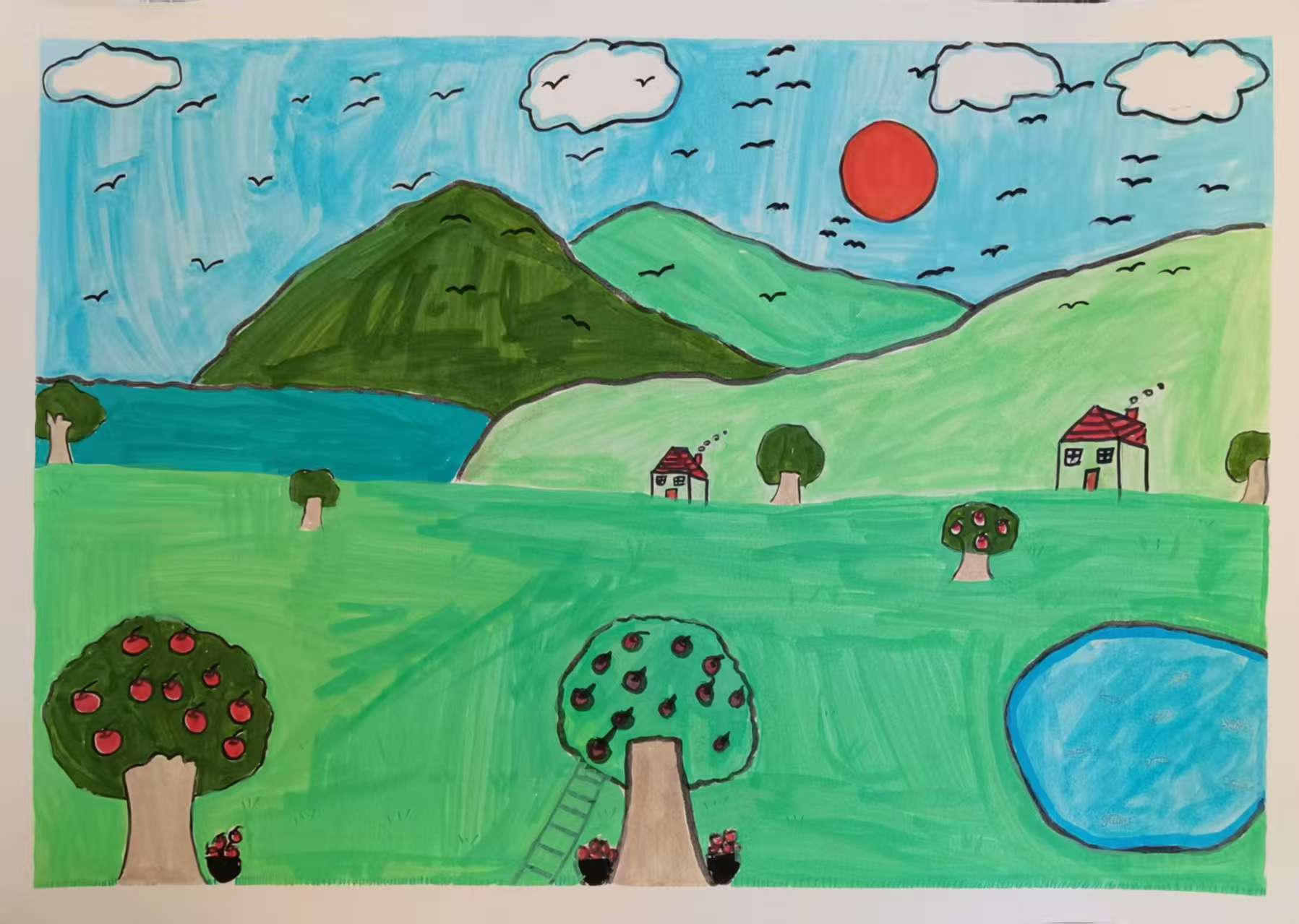 这幅儿童画展现了一处美丽的自然风光。左侧是大片绿色草地,有结满红果和褐果的果树,树下有人物,还有池塘、梯子;右侧是山水景致,有起伏的青山、河流,天空中飘着云朵,飞着小鸟,挂着红日,草地上还分布着几座小房子与几棵小树,整体色彩鲜艳,充满童趣,仿佛是一处适合度假的自然乐园,体现出孩子对美好自然场景的想象与描绘。