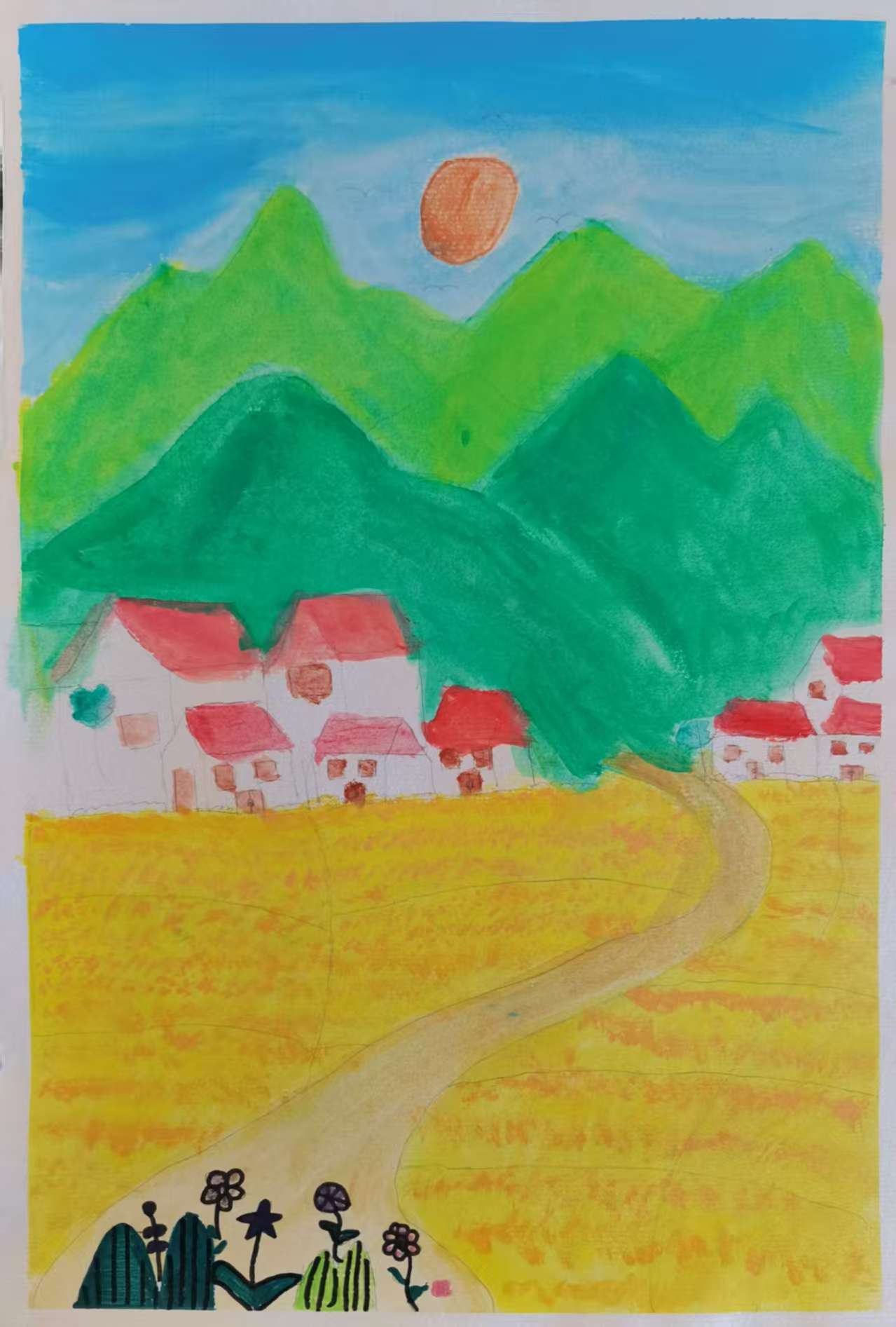 这幅画是一幅水彩创作的乡村风景,展现了油菜花田主题的场景。画面上方是蓝天与橙日,中间是两层绿色山峦,山前有红顶白墙的房屋,下方是金黄的田野,一条小路蜿蜒穿过田野,通向村庄。左下角还有花草、仙人掌等植物点缀,整体色彩明快,营造出清新自然、充满生机的乡村氛围,仿佛能让人感受到乡村的宁静与美好。