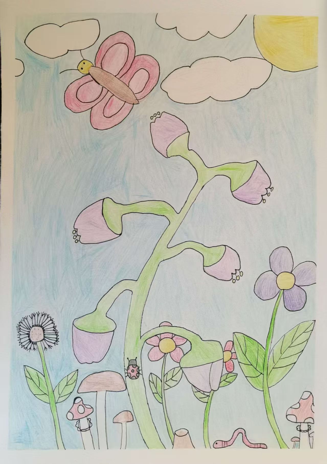 这幅画展现了春日生机。画面上方,浅蓝色天空飘着白云,黄色太阳散发暖意,粉色蝴蝶灵动飞舞。中间,绿色茎秆的风信子花开紫色,旁有各色小花、带籽蒲公英。下方,蘑菇群中瓢虫爬茎,粉色小蛇穿梭,整体色彩鲜亮,童趣满溢,洋溢着春日欢快氛围。