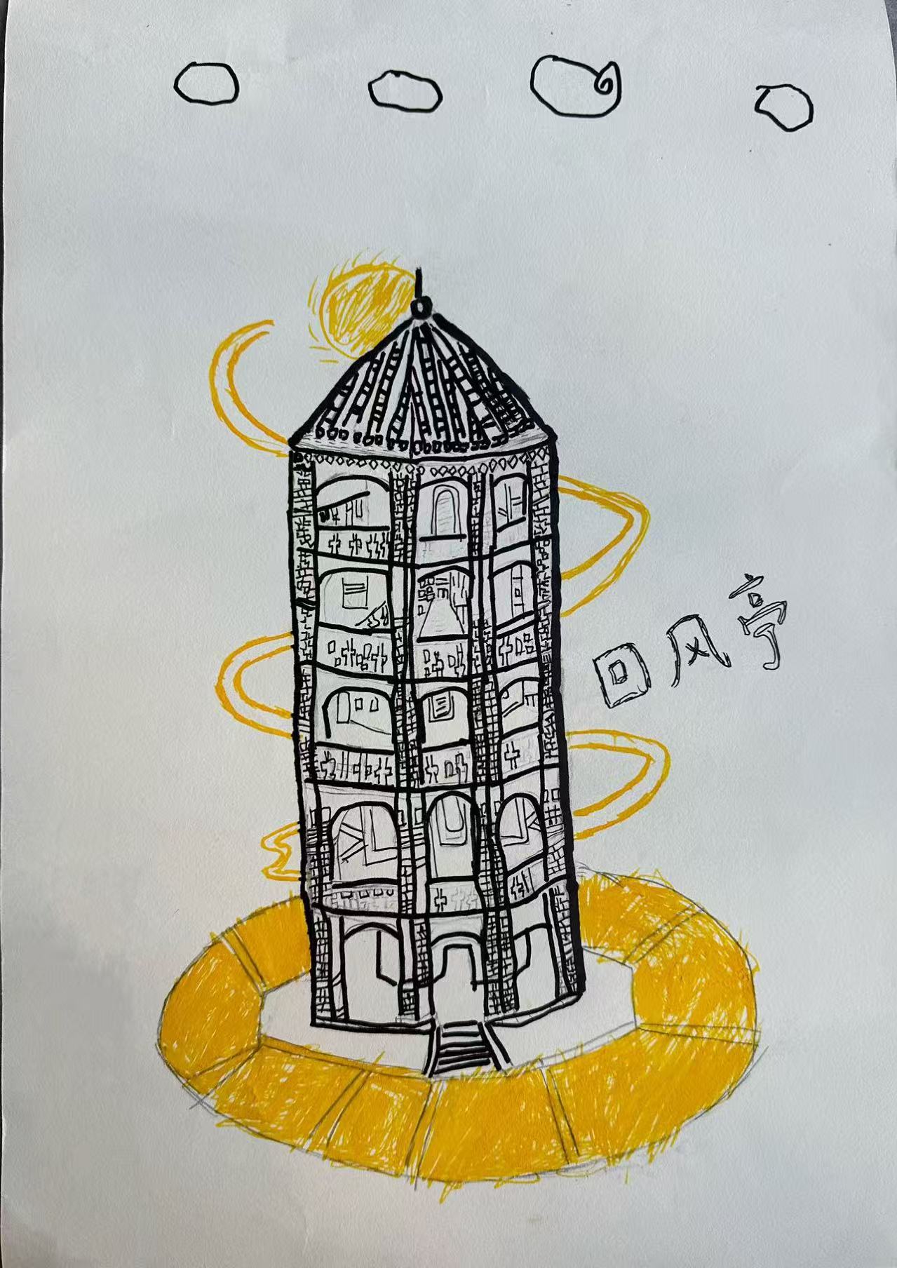 它绘的是巴中回风亭:塔状楼阁配螺旋纹饰,暗合"风回气聚"的巴地风水意涵。这座1926年建成的建筑,融中式攒尖顶与西式立面,是川北少有的中西合璧地标,曾为军事瞭望台,今成巴城文化符号,画中旋纹既衬"回风"之名,也藏着巴山建筑的独特韵味。