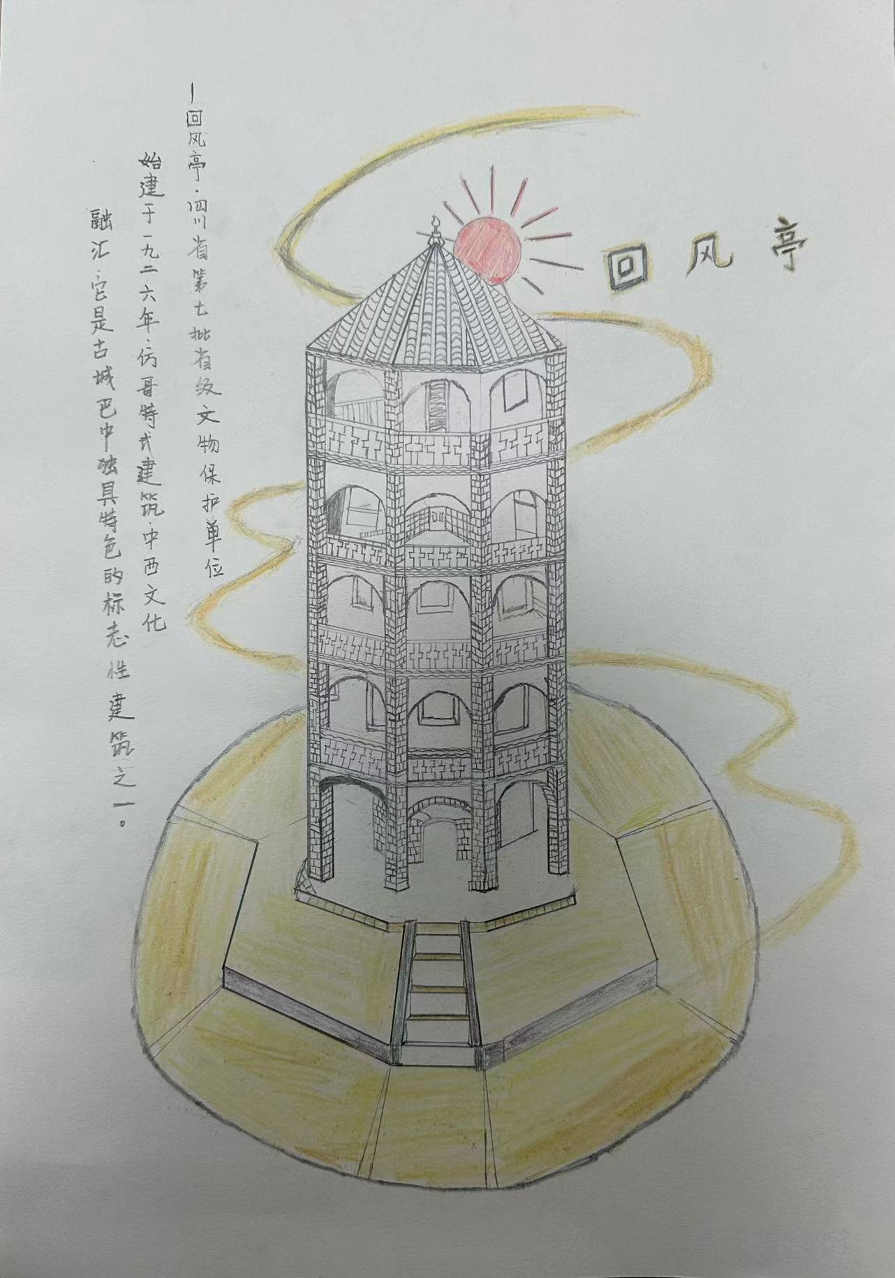 它绘的是巴中回风亭:作为省级文保单位,1926年仿哥特式建成的它,是川北少有的中西文化交融建筑。塔楼式结构裹着中式攒尖顶,既曾作军事瞭望台,今又是巴城地标,画中旋纹呼应“回风”之名,也凝着古城巴中“西韵中魂”的建筑特色。